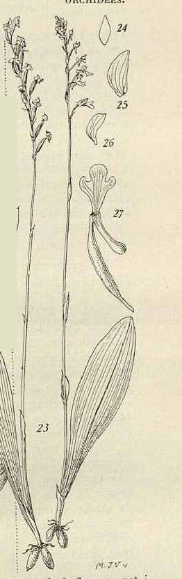 Found in south central Madagascar in mossy forests and wet areas at elevations of 1200 to 2200 meters as a small sized, cool to cold growing terrestrial with 2 rounded to elongated tubers giving rise to a single basal, elliptic-oblong leaf that blooms in the later summer and earlier fall on an erect, terminal, glabrous, 6 to 12" [15 to 30 cm] long, 6 to 9 flowered inflorescence with lanceolate, very acuminate, much shorter than the ovary floral bracts