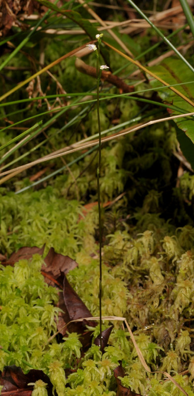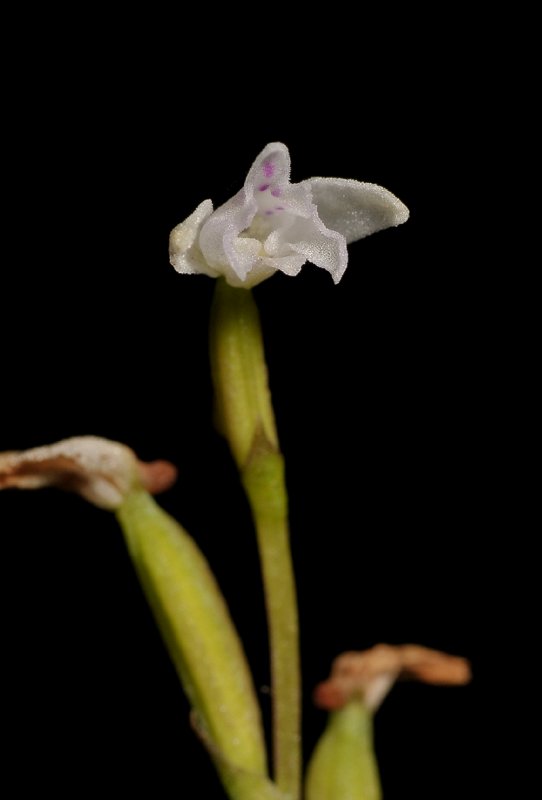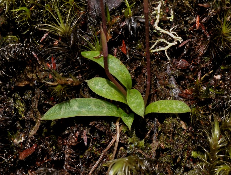 Found in Reunion and north and central Madagascar in ericoid bushes at elevations of 1200 to 2600 meters as a small sized, cool to cold growing terrestrial with small, irregular, elongated, villous tubers giving rise to a basally sheathed stem carrying just above, 2, lanceolate to oblanceolate, very acute, attenuate to a long petiolate base, flat against the soil leaves that blooms in the summer and fall on a terminal, erect, with 2 distinct, very distant bracts, 6 to 12" [15 to 30 cm] long, loosely 3 to 10 flowered inflorescence with lanceolate-acute, much sdhorter thant he ovary floral bracts and carrying veryh small, sessile, very finely papillose externally, whiteto violet both maculate wioth deep violet flowers.