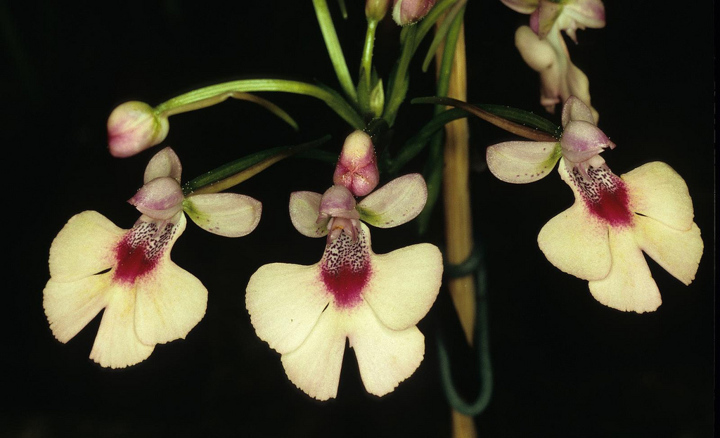 Found in montane and riverine forests on banks and rocks at elevations of 800 to 1800 meters as a small to just medium szied, warm to cool growing terrestrial with a solitary, basal, strap-shaped leaf that blooms in the later spring on an erect, terminal, to 14" [35 cm] long, arising from a newly developing shoot, green suffused with brown red, densely 10 to 35 flowered inflorescence with green, red tipped floral bracts.
