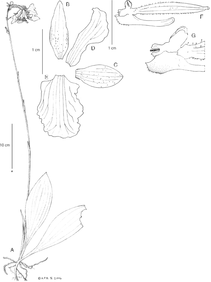 Cynorkis mangabensis Hermans & P.J.Cribb 2017 SECTION Imerinorchis A habit (from herbarium sheet); B dorsal sepal; C lateral sepal; D lateral petal; E labellum; F lateral view of column, ovary and spur; G lateral view of column in situ. From Antilahimena 2644; A from herbarium sheet, * approximate scale; B – G after J. Hermans drawings - Drawing by © Andrew Brown and