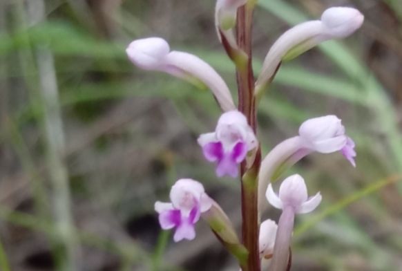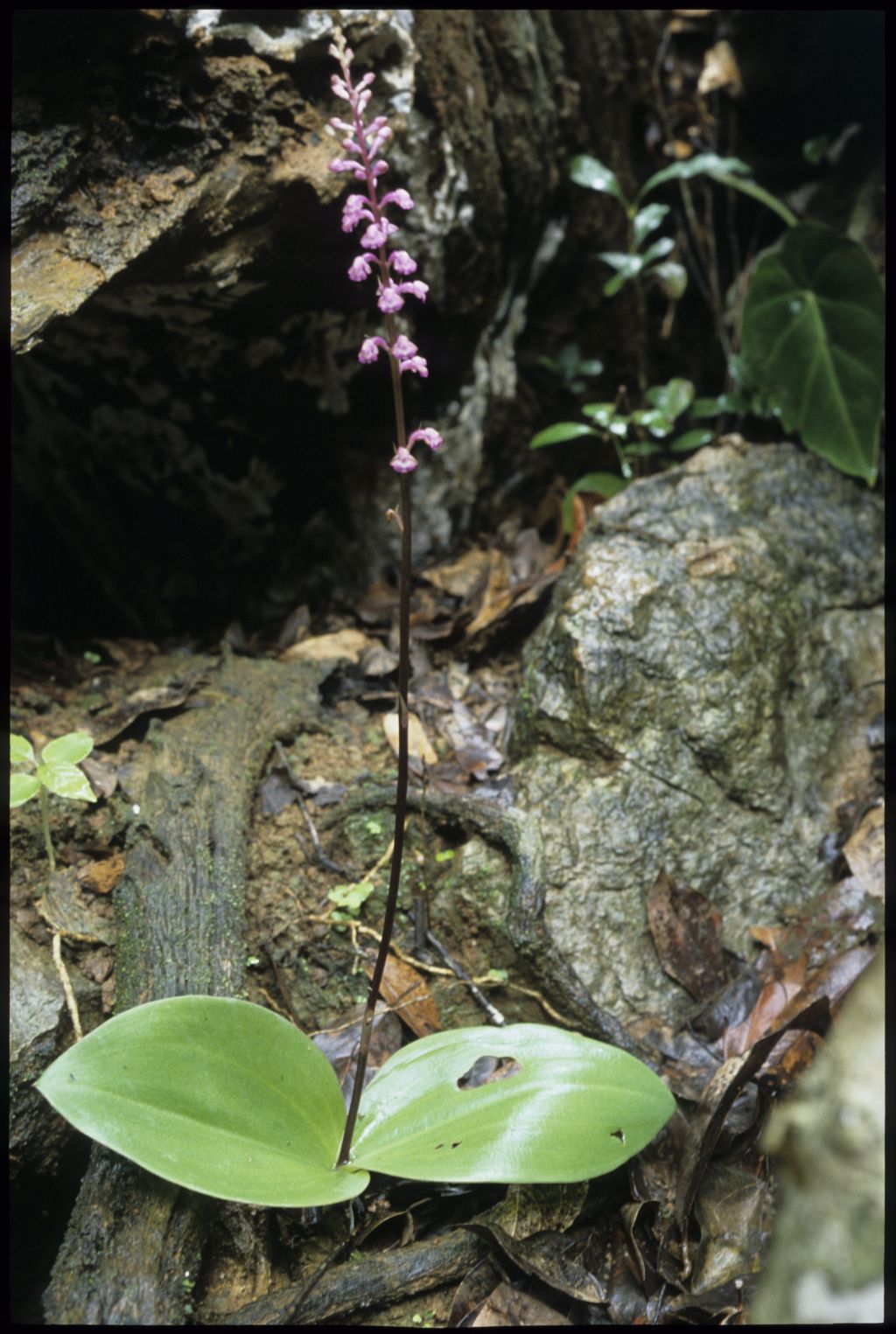 Found in northwestern Madagascar in grasslands and open dry forests on calcareous rocks in leaf detrius at elevations of 250 to 2000 meters as a mini-miniature sized, hot to cool growing terrestrial with 2, radical, ovate, prostrate on the substrate, acute leaves that blooms in the late spring and summer on an erect, glabrous, 2" [5 cm] long, many flowered inflorescence with as long as the ovary floral bracts