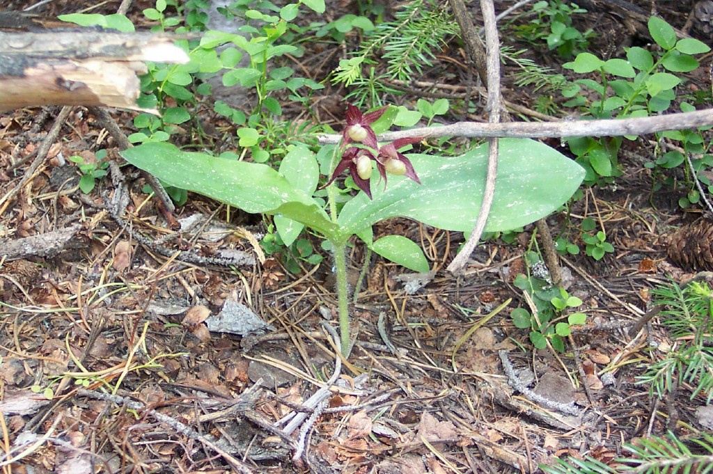 A western American, medium sized, cold growing terrestrial found in moist or dry coniferous forests in acidic soils between 800 and 1700 meters with elliptic, plicate, opposite, pubescent beneath leaves that blooms in the spring and summer on a terminal, slender stalked, fasciculate inflorescence that carries up to 4 clustered flowers, each subtended by a leaflike floral bract and all arising from the center and being held well above the almost mature 2 opposing leaves held high on a stem.