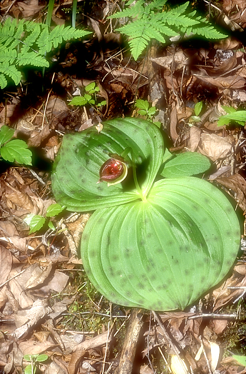 Found in Sichuan province of China in bamboo and deciduous thickets in humus rich soils at elevations around 2380 meters as a small sized, cold growing terrestrial needing humid cold summers with an erect, glabrous stem enveloped by a single sheath and carrying broadly elliptic to suborbicular, plicate, light green, red spotted, obtuse leaves that blooms in the spring on a terminal, erect, 2" [5 cm] long, short, single flowered inflorescence with no floral bract.