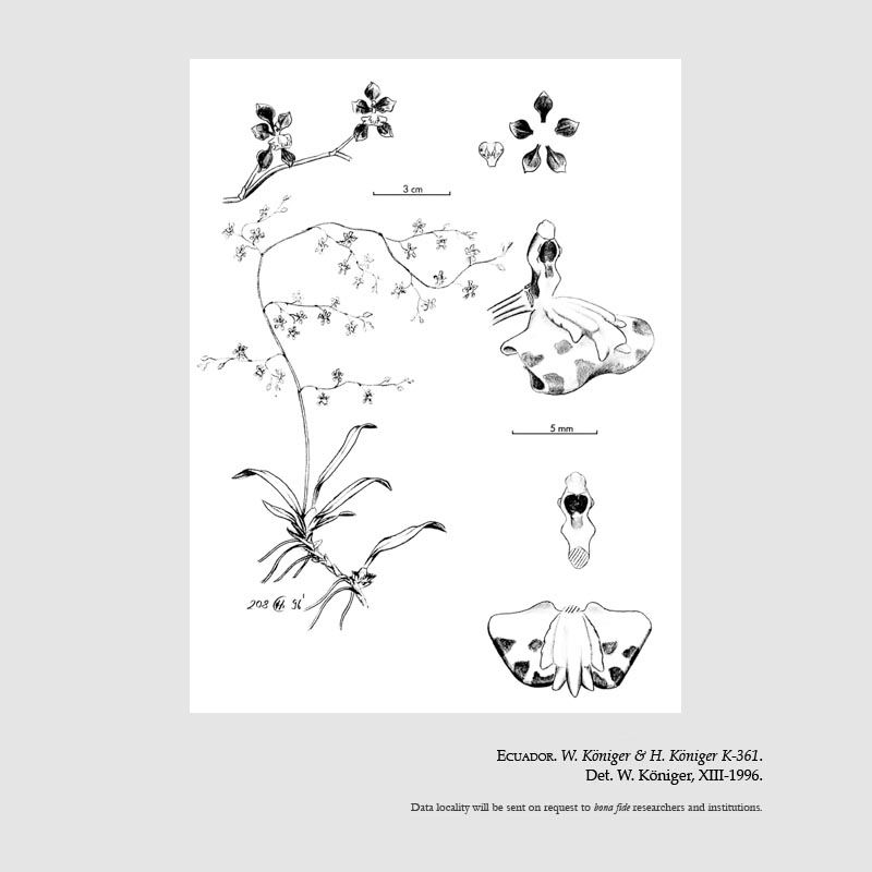 References W3 Tropicos, Kew Monocot list , IPNI ; Native Ecuadorian Orchids Vol 4 Dodson 2003 as Oncidium porrigens drawing/photo fide; Orchid Species Culture Oncidium/Odontoglossum Alliance Bakers 2006; Flora of Ecuador No 87 225[3] Orchidaceae Dodson & Luer 2010 drawing fide