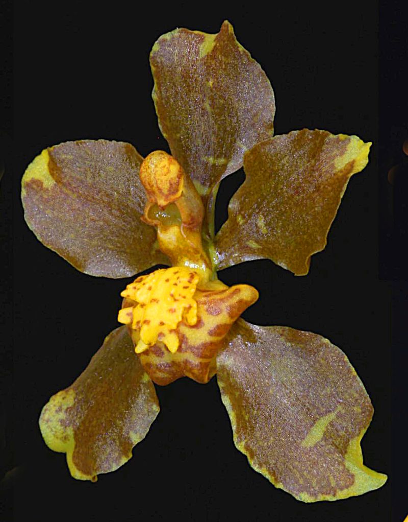 Found in western Ecuador at elevations around 1150 meters, often in orange trees as a large sized, warm to cool growing epiphyte with up to 16" [40 cm] between each elongate-ovate, laterally compressed pseudobulb enveloped by 6 to 8, foliaceous sheaths and carrying 1 to 2, apical, erect, obovate, narrowly acute to acuminate, conduplicate below in to the petiolate base leaves that blooms in the summer on an axillary, erect, wiry, to 8' [2 meters] long overall, peduncle to 16" [40 cm] long, paniculate, to 15 widely spaced, weakly flexuous, to 12" [30 cm] long, each, loosely several to many flowered branches, sometimes shortly rebranching, with adpressed, scale-like, acute bracts and carrying fragrant flowers.