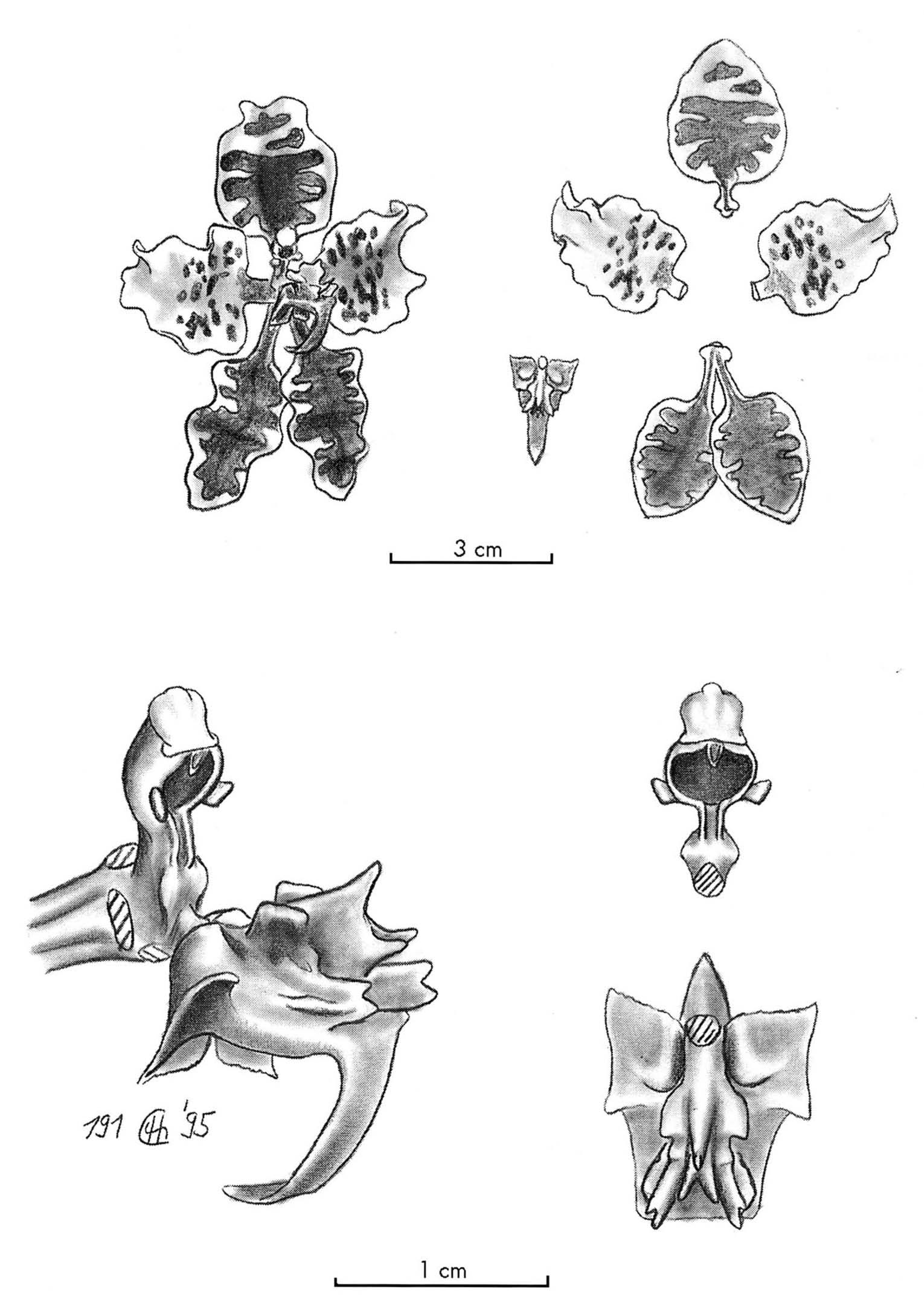 Similar to C ionodon but differs by the more rounded apex of the column, the finely serrate column wings and the sepals, particularly the dorsal, which are weakly auriculate. In C ionodon the column apex is distinctly triangular acute, the column wings are more truncate and the sepals, particularly the dorsal are distinctly auriculate.
