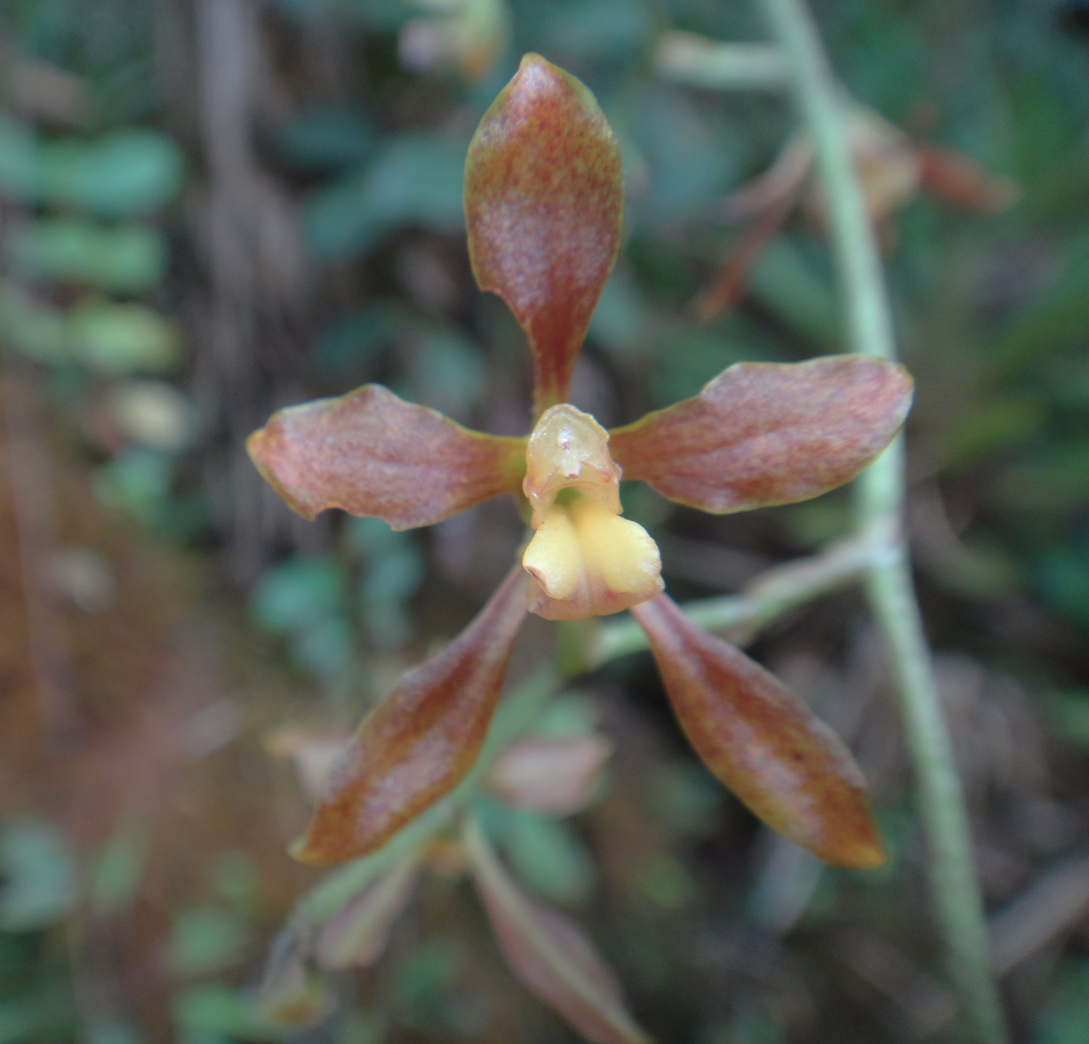 Found in Colombia and Ecuador in dense upper montane cloud forests at elevations of 2600 to 3600 meters as a small sized, cold growing terrestrial or epiphyte with a caespitose to slightly creeping to a long wiry rhizome that gives rise to keikis, like on an inflorescence, ovate, slightly flattened pseudobulbs enveloped partially below by distichous sheaths becoming leaf bearing above and carrying a single, apical, erect, narrowly obovate, acute, becoming conduplicate below into the elongate petiolate base leaf that blooms in the late winter through fall on an axillary, erect, elongate to 4' [120cm] long, scandent, twinning and strongly twisting, scabrous, paniculate, wiry,strongly twisting, many flowered inflorescence that can have plantlets arising from older inflorescence.