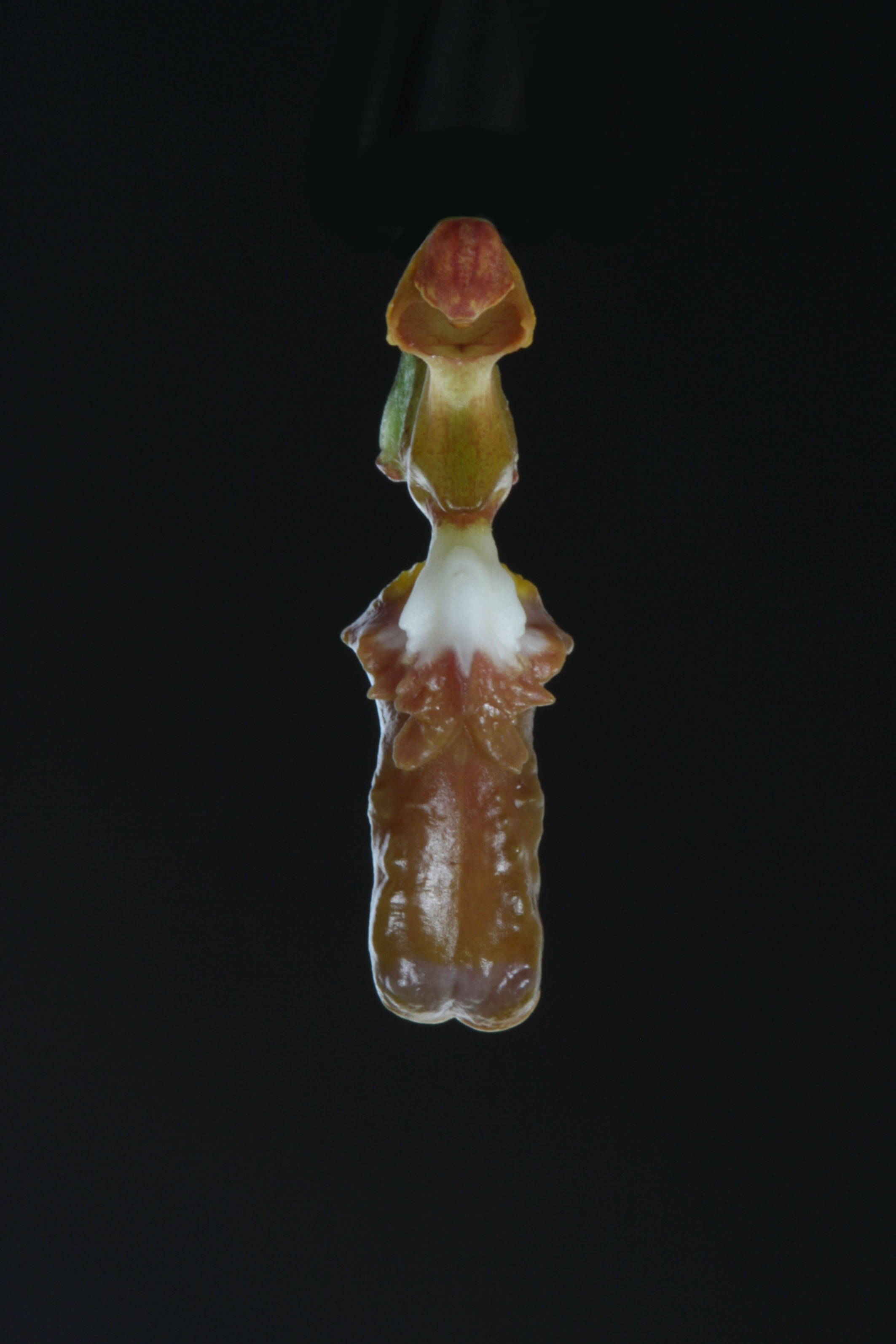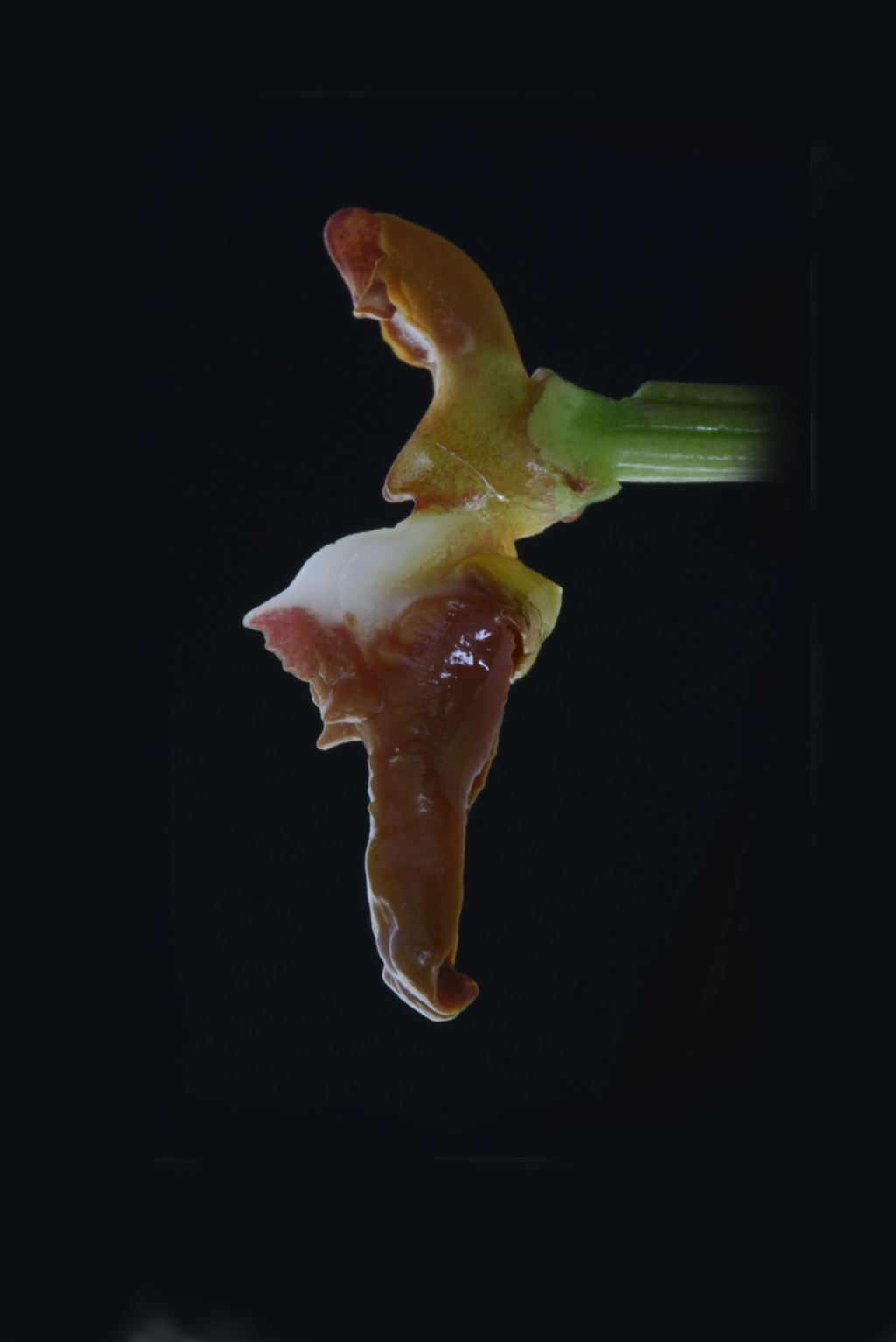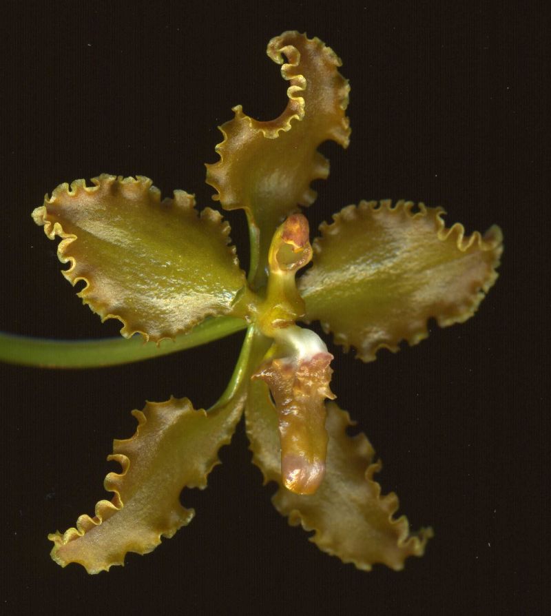 Found in Loja province of Ecuador and Peru on the western slopes in montane cloud forests at elevations around 1900 to 2400 meters as a medium sized, cool to cold growing epiphyte with narrowly ovoid, close set pseudobulbs enveloped basally by several pairs of distichous, imbricating, leaf-beaaring sheaths and carrying a single, apical, narrowly oblong, tapering in both directions to an acute apex and a narrow conduplicate base leaf that blooms in the spring and summer on an axillary, erect then twining, vine-like, to more than 39" [100 cm+] long, paniculate, many flowered inflorescence with the widely spaced flowers held in the apical 1/3 on a few, 10" [25 cm] long branches with up to 6 flowers on each branch.