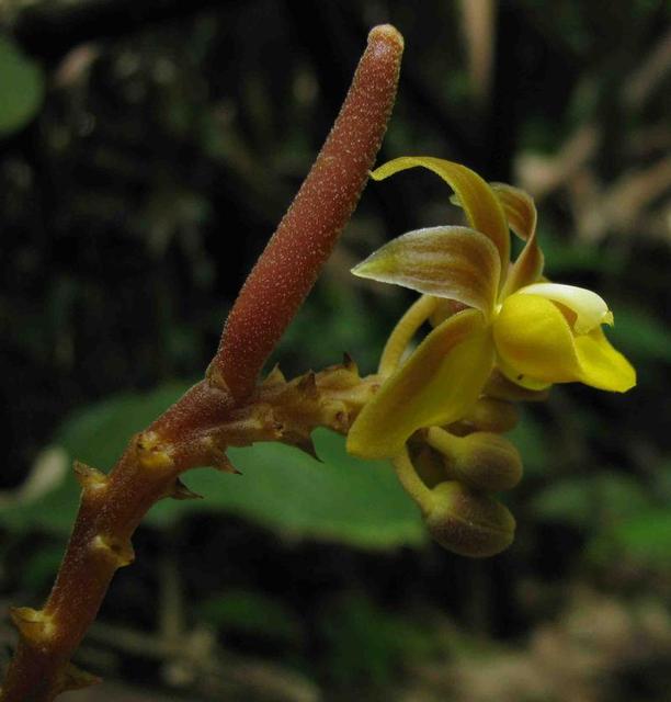 Found in Yunnan province of China, Thailand, Laos and Vietnam in tropical evergreen forests at elevations around 300 to 1000 meters as a small to medium sized, hot to warm growing, mycoheterotrophic terrestrial with an erect, branched at nodes stem with glabrous to pubescent, ovate, acute, coriaceous sheaths that blooms in the spring on an erect, terminal and often several, axillary racemes, furfuraceous, 8 to 26" [20 to 65 cm] long, many flowered inflorescence with ovate, furfuraceous bracts