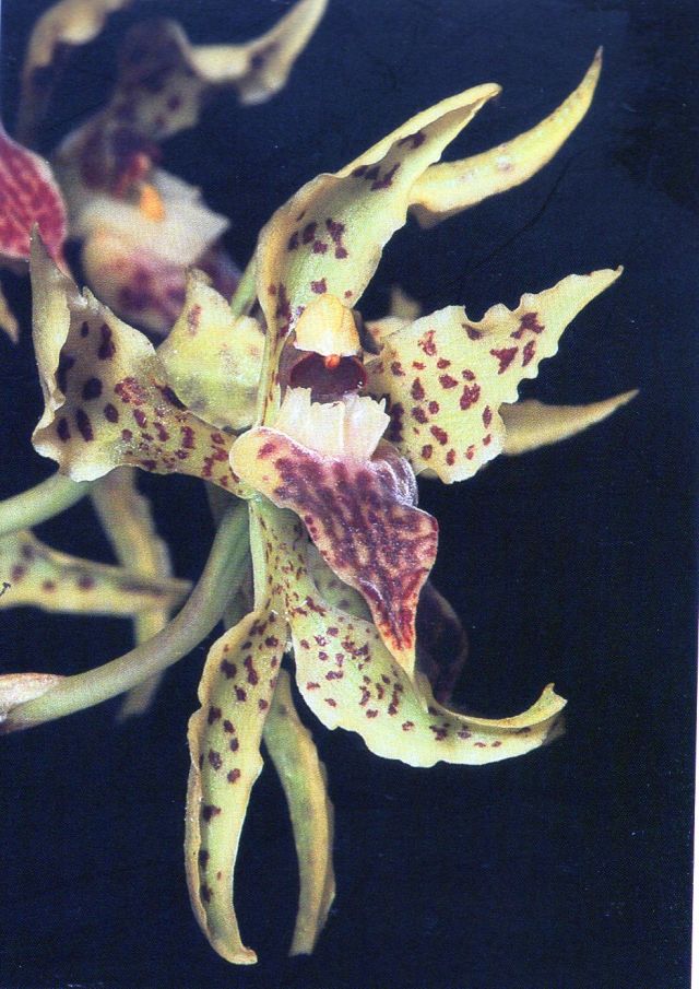 Found in Loja Ecuador in montane cloud forests at elevations around 2900 to 3400 meters as a medium sized, cold growing epiphyte with caespitose, oblong-ovoid pseudobulbs enveloped basally by 4 to 7 distichous sheaths with the uppermost leafbearing and carrying 1 to 2, apical, elliptic, conduplicate below into the petilolate base leaves that blooms in the spring on an axillary, erect to suberect, 5' [150 cm] long, paniculate, with 6 to 8, widely spaced, spreading, slightly flexuous, loosely to 8 flowered branches, 40 to 60 flowered inflorescence.