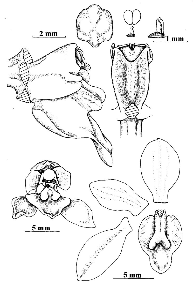 Found in Loja and Zamora Chinchip Ecuador and northern Peru in high elevation scrub forests in low dense shrubs in wet areas at elevations of 2700 to 3150 meters as a medium sized, cold growing terrestrial or epiphyte with a stiff, bracteate, creeping rhizome giving rise to caespitose to distant, ovoid, slightly ancipitous pseudobulbs enveloped basally by 6 to 8 distichous, uppermost foliaceous sheaths and carrying 1 to 2, apcial, conduplicate, narrowly obovate to elliptic, acute to acuminate leaves that blooms in the late fall through later summer on an axillary, from the uppermost sheaths, erect, weakly fractiflex, few flowered racemes to loosely paniculate, few branched, distant, 2 to 12 flowered, apically fractiflex, several to many flowered inflorescence with scale-like adpressed bracts and carrying slightly campanulate flowers.