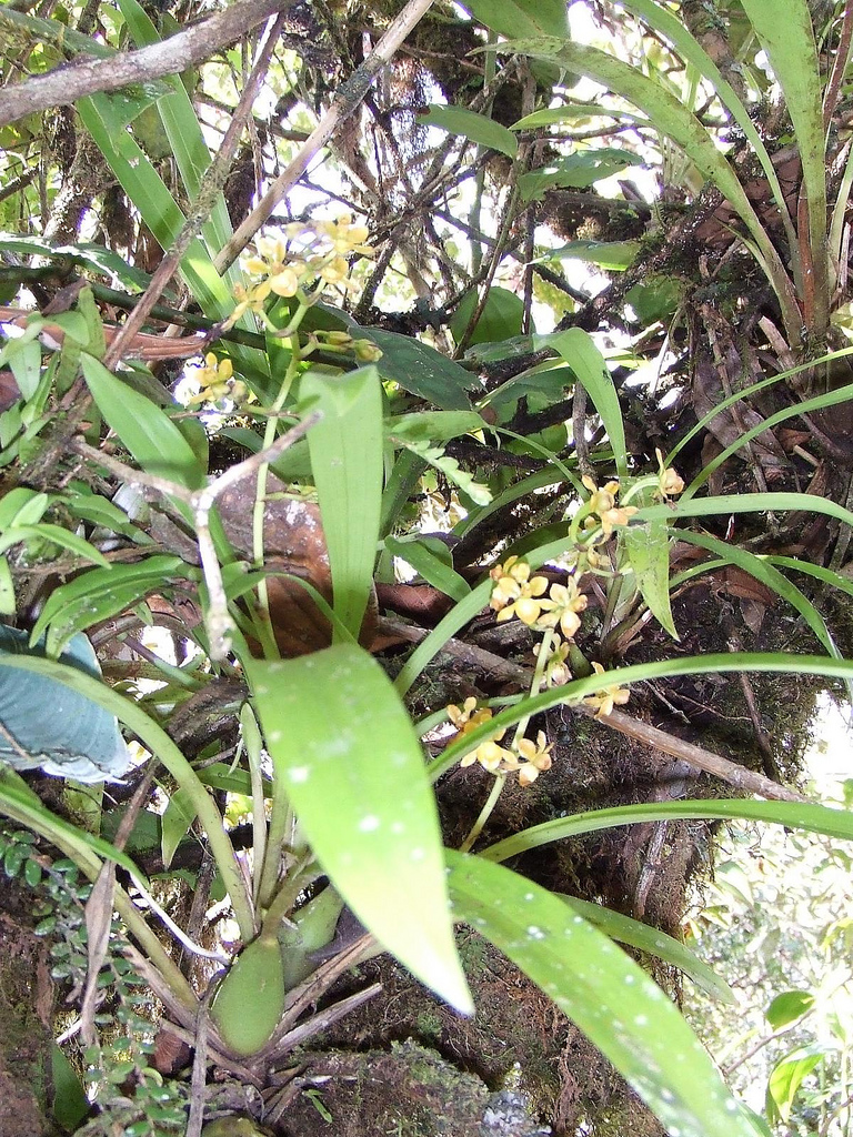Found in Venezuela, Colombia, Ecuador near Quito, Peru and Bolivia at elevations around 1850 to 2250 meters as a medium sized, cool to cold growing epiphyte or terrestrial with ovate or elliptic-ovate, laterally compressed, ancipitous pseudobulbs carrying lanceolate, acute, narrowing below into a conduplicate, slightly petiolate base leaves that blooms in the fall, winter and spring on an axillary, 21" [51 cm] long, apically fractiflex, paniculate, shortly branched, widely spaced, each branch 2 flowered, 2 to 2.4" [5 to 6 cm] between each flower, to 12 flowered, inflorescence arising on a mature pseudobulb with a few widely spaced, branches and carrying many widely spaced 2 to 2.4" [5 to 6 cm] flowers.