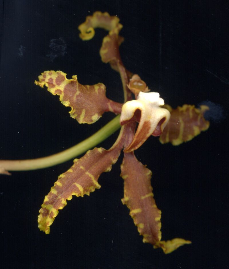 Found in Venezuela, Colombia and Peru in dense thickets and brambles in thin soil on large boulders at elevations of 1900 to 2700 meters as a medium sized, cold growing epiphyte or terrestrial with a climbing rhizome giving rise to green, wrinkled, strongly compressed, ovoid pseudobulbs enveloped basally by several persistent, leaf bearing sheaths and carrying 2 to 3, apical, strap-shaped, sharply acute, tightly conduplicate below into the short, petiolate base leaves that blooms in the winter on an axillary, to 79" [to 200 cm] long, long pdunculate, many [to 50] flowered, paniculate inflorescence with somewhat short branches that can rebranch and can carry up to 8 flowers on each.