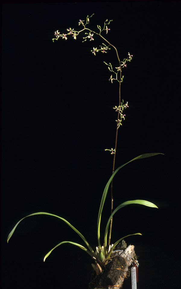Found in Cundinamarca department of Colombia as a cool growing orchid and blooms on a very long, twining, paniculate, each branch 1.2 to 1.6" [3 to 4 cm] long, each 2 to 3 flowered, many flowered inflorescence