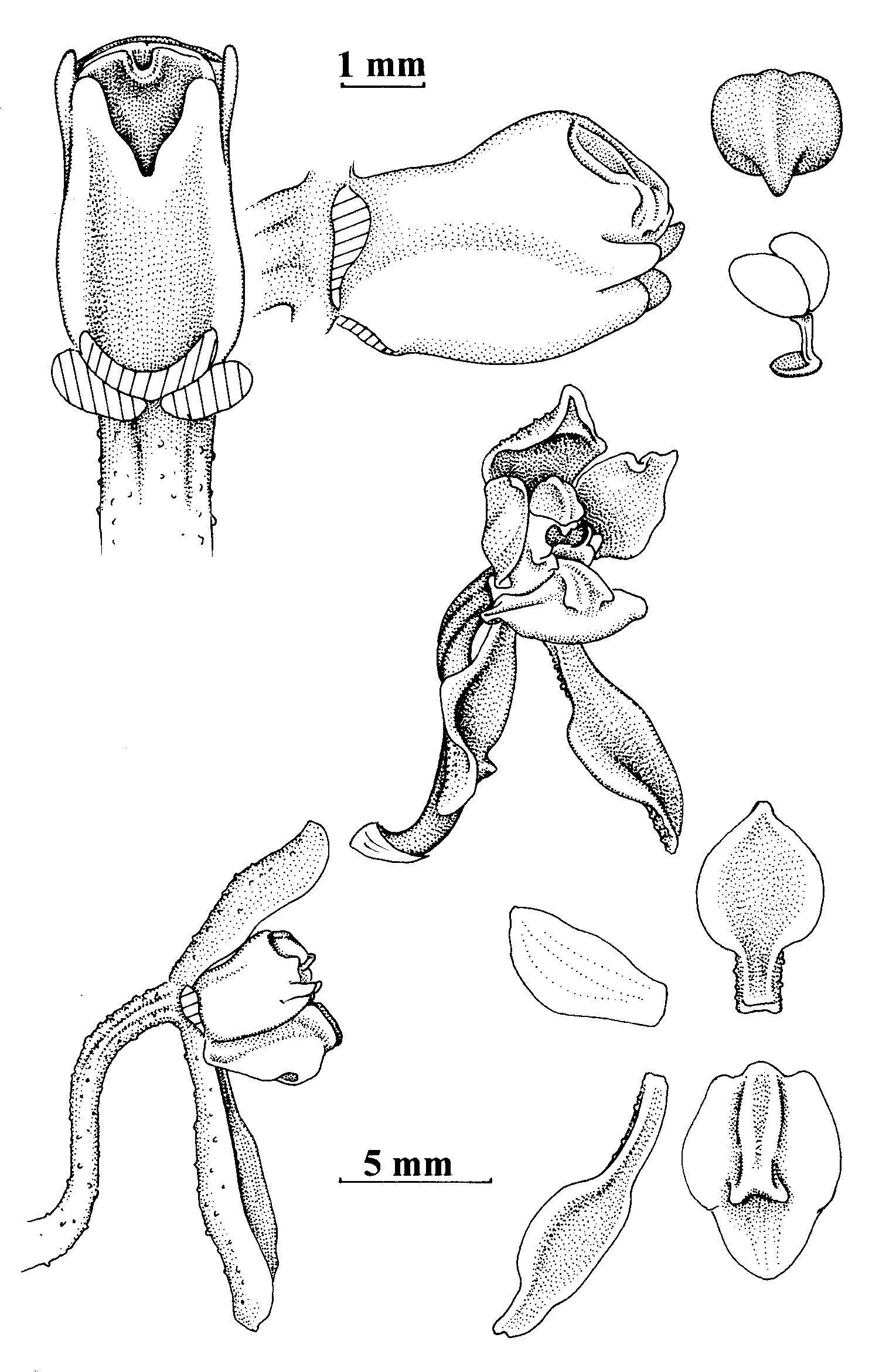 Found in Morona-Santiago and Zamora Chinchipe Ecuador to northern Peru in shrubby montane forests at elevations of 2600 to 3000 meters as a small sized, cold growing epiphyte with a wiry, creeping rhizome giving rise to distant or caespitose, keiki-like on an inflorescence, ovoid pseudobulbs enveloped by 5 to 8 distichous, foliaceous sheaths and carrying a single, apical, conduplicate, narrowly ovate to elliptic, acuminate,, shortly petiolate base leaf that blooms in the winter on 1 to 2, axillary, from the uppermost sheaths, stiff, more or less verruculose, wiry, peduncle with 4 to 6, adpressed, scale like bracts, to 4' 4" [130 cm] long overall, loosely paniculate, widely spaced, each side branch .8 to 1.2" [2 to 3 cm] long, 3 to 6 flowered each, many flowered inflorescence with small, adpressed, scale like floral bracts and carrying slightly campanulate flowers.
