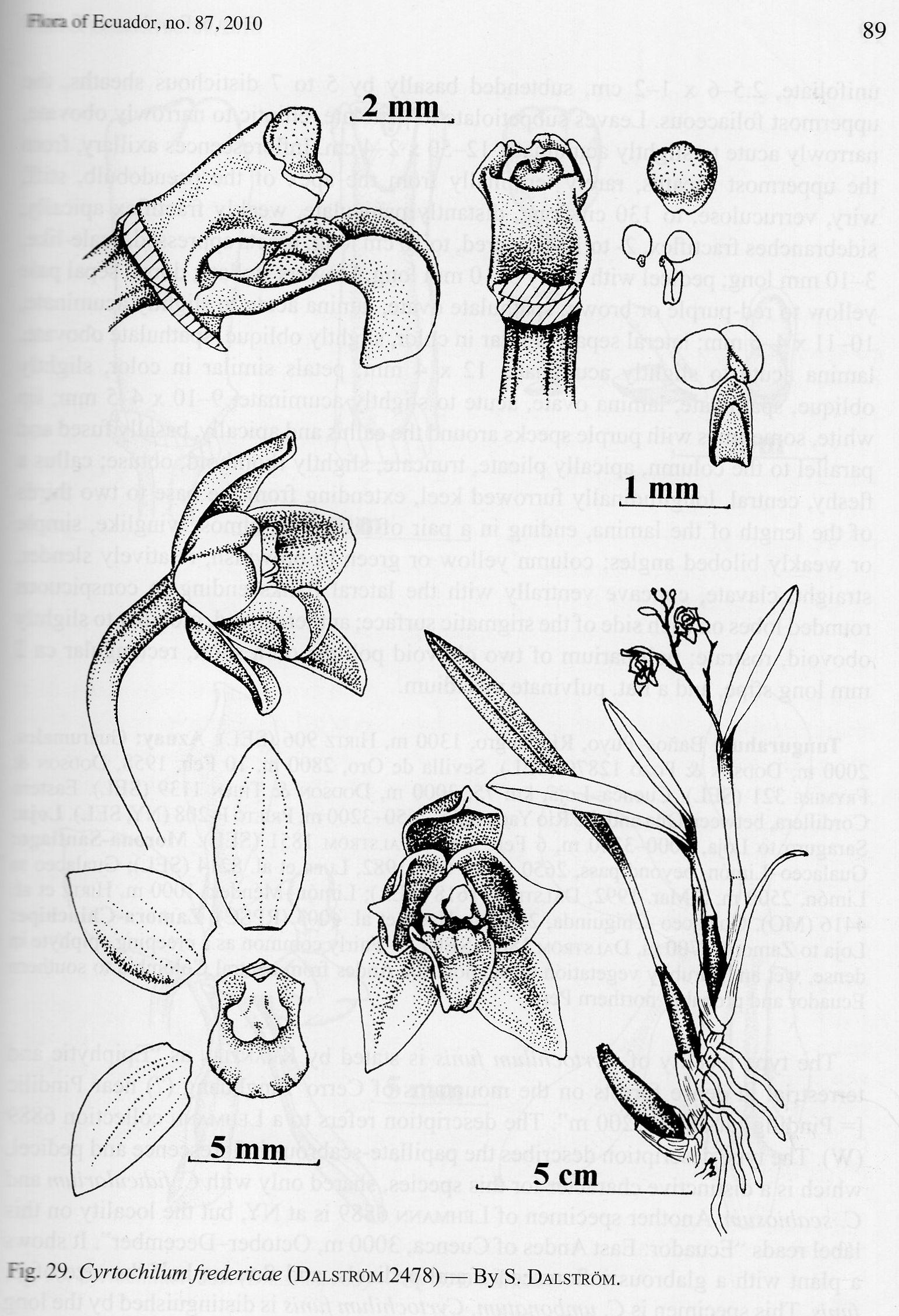 References W3 Tropicos, Kew Monocot list , IPNI ; *Flora of Ecuador #87 225[3] Dodson & Luer 2010 drawing/photo fide; AOS Bulletin Vol 80 #8 2011 photo fide Nomenclature notes 10 New Cyrtochilum Species Dalstrom & Higgins photo fide