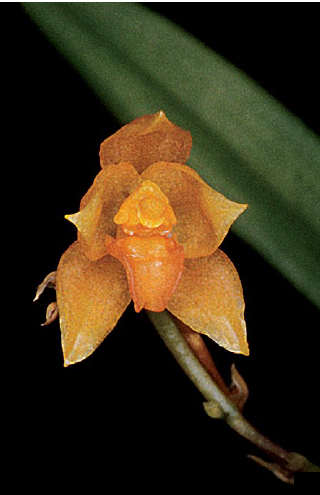 Found in southern Ecuador in shrubby montane forests at elevations of 2000 to 2300 meters as a small sized, cold growing epiphyte with a creeping, branching rhizome giving rise to slightly distant, elongate ovoid pseudobulbs enveloped by 5 to 7 distichous, uppermost foliaceous sheaths and carrying a single, apical, conduplicate, narrowly elliptic, acute, subpetiolate base leaf that blooms in the fall on an axillary, from the uppermost sheaths, weakly fractiflex racemes or few branched, panicles 4 to 4.8" [10 to 12 cm] long, few flowered each, several flowered inflorescence with small, adpressed, scale like floral bracts and carrying slightly campanulate flowers.