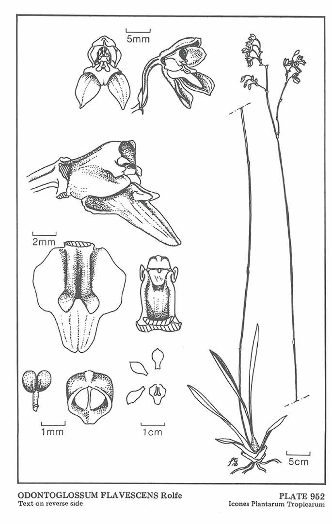 References W3 Tropicos, Kew Monocot list , IPNI ; Bonplandia Rchb.f 1854 as Odontoglossum longipes; Das Pflanzenreich Odontoglossum/Oncidium Kranzlin 1922 drawing ok; Orchids of Peru Vol 4 Schweinfurth 1961 as Odontoglossum flavescens; Orchids of Peru Vol 4 Schweinfurth 1961 as Odontoglossum longipes; Fieldiana Biology, Vol 33, 1st Supple. to the Orchids of Peru Schweinfurth 1970; Icones Planetarum Tropicarum Plate 952 Ecuador Dodson 1984 as Odontoglossum flavescens drawing ok; Icones Planetarum Tropicarum Plate 958 Ecuador Dodson 1984 as Odontoglossum longipes drawing ok; Icones Orchidacearium Peruviarum Bennet & Christensen Plate 331 1995 drawing ok; Rudolf Schlechter Die Orchideen Band 1C lieferung 33 - 36 2057 - 2308 Brieger 1997 as Trigonochilum flavescens drawing fide; Icones Orchidacearium Peruviarum Bennet & Christensen Plate 727 2001 as Odontoglossum flavescens drawing fide; Lindleyana Vol 16 No 2 2001; Orchid Species Culture: Oncidium/Odontoglossum alliance Bakers 2006; Orquideas del Peru Freuler 2010 photo fide; LANKESTERIANA 20(1) Dalstrom & Trujillo 2020