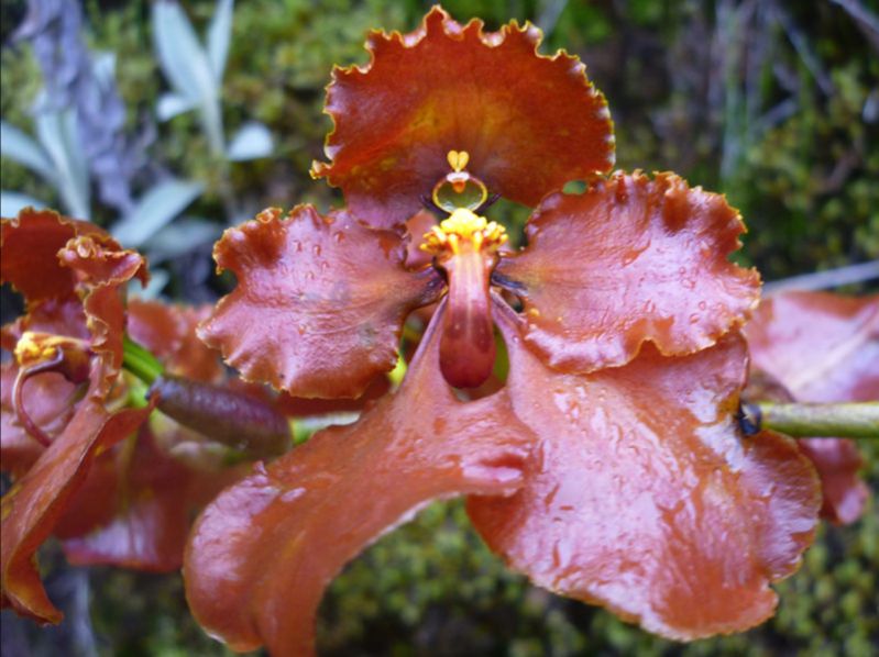 Found in Colombia in cloud forests and blooms in the later spring on a very long, paniculate, relatively shortly branched, many flowered inflorecscence.