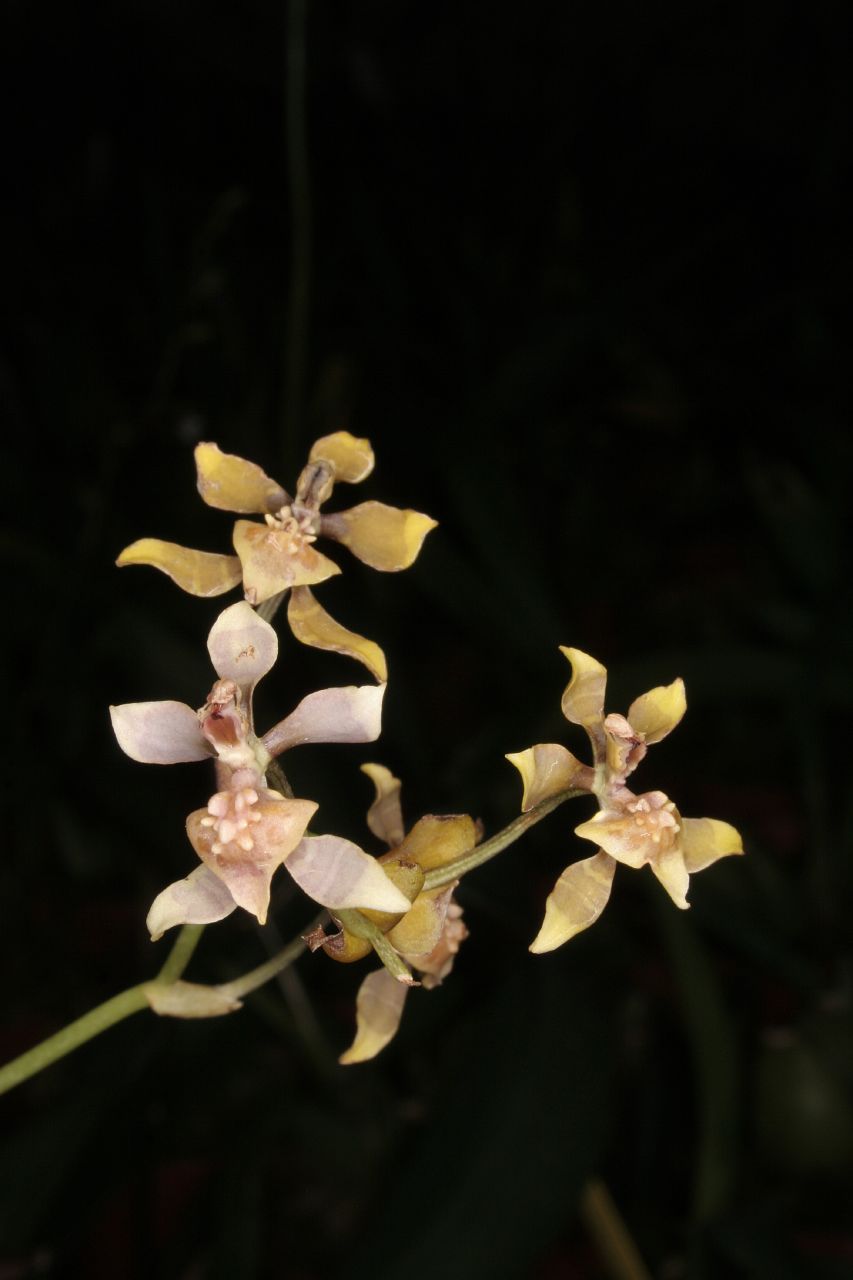Found in Colombia, Ecuador and Peru at elevations of 1700 to 3000 meters as a medium to large sized, cool to cold growing epiphyte with light green, laterally compressed, deeply longitudinaly grooved pseudobulbs enveloped partially below by several pairs of imbricate, leaf bearing sheaths and carrying 2, apical, thin, fairly stiff, strap shaped, acute, conduplicate leaves that blooms in the fall and winter on an axillary, stout, slightly compressed, to 59" [150 cm] long, erect to arching, paniculate, few to many, fractiflex branched, many flowered inflorescence arising on a recently matured pseudobulb with each branch being 12" [30 cm] long, that rebranch secondarily with up to seven separate branches with each carrying 4 to 8 flowers.