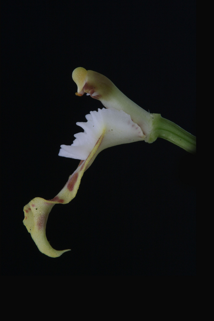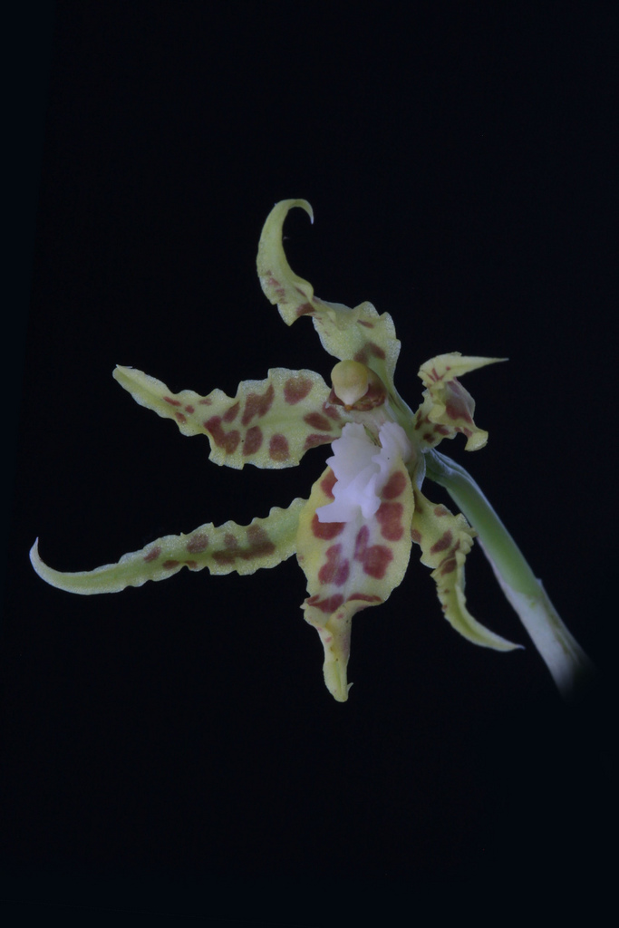 Found in Peru and Bolivia in cold wet cloud forests at elevations of 2700 to 3100 meters as a medium to large, cold growing, caespitose terrestrial with ovoid-pyriform, unifoliate, lightly complanate, sulcate, furrows obtuse angled pseudobulbs that are basally enveloped by 3 to 4 pairs of sheaths, scarious below and articulated leaf-bearing above that has a single, apical, narrowly oblong-lanceolate, attenuate to the petiole acute apically leaf that blooms in the late winter and early spring on an erect, long, scapose, 2'+ [60 cm] long, paniculate, horizontallyto almost pendent, 5 to 6 branched each 5 to 8 flowered, 25 to 50 flowered inflorescence.