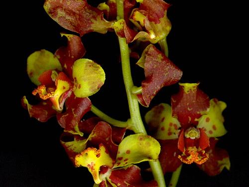 Found in Minas Gerais, Sao Paulo, Santa Catarina and Parana' states of Brazil and northern Argentina as a medium to giant sized, cool growing epiphyte with clustered, erect, fusiform-elongate, many noded pseudobulbs enveloped by grey white sheaths when young and carrying plicate, linear to elliptic-lanceolate, acute to acuminate, distichous, spreading or recurved, elongate at the subpetiolate base leaves that blooms in late spring on a basal, branching, heavily bracteate, up to 5' [to 150 cm] long, many flowered inflorescence arising with a new growth and carrying fragrant flowers