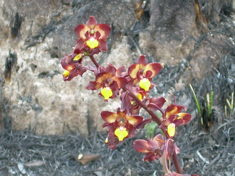 Found in Goias and Minas Gerais states of Brazil in dry fields that have annual brush fires with small, conical-elongate pseudobulbs completely buried in the substrate that blooms in the late winter and early spring on a simple, unbranched, 8 to 14 flowered inflorescence with lanceolate, longer than the pedicel floral bracts