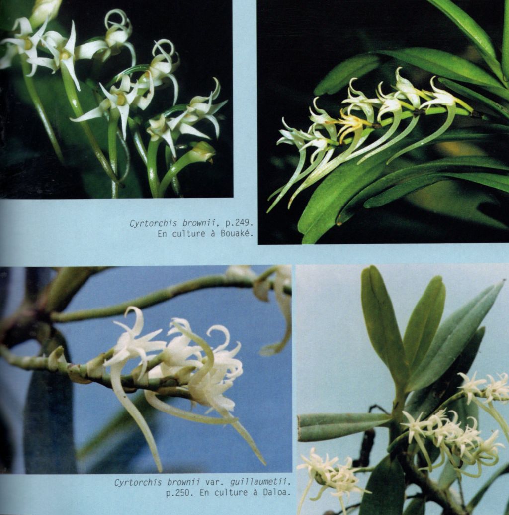 References W3 Tropicos, Kew Monocot list , IPNI ; Orchids of East Africa Piers 1968 photo ok; Flora of Tropical East Africa Orchidaceae Part 3 Cribb 1989; Orchids of Kenya Stewart 1996; The Orchids of Kenya Stewart & Campbell 1996; African Orchids in the Wild and Cultivation La Croix 1997; Les Orchidees de Cote d'Ivorie Perez-Vera 2003 photo/drawing fide; Les Orchidees de Cote d'Ivorie Perez-Vera 2003 as C brownii var guillaumetii photo/drawing fide; Angraecoid Orchids Stewart, Hermans and Campbell 2006; Phytotaxa 267 (3) 173 Droissat & Azandi 2016 photo fide; AOS Bulletin Vol 87 #1 2018 photo fide;