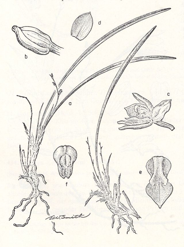 Found in Peru in cloud forests at elevations around 2800 meters as a small sized, cold growing epiphyte with an ascending bracteate rhizome giving rise to basally thickened, attenuate above pseudobulbs enveloped almost completely by linear, imbricating foliaceous sheaths and carrying a single, apical, linear, conduplicate towards the base leaves that blooms in the summer on an axillary, slender, suberect, linear, racemose, to 6" [15 cm] long, 3 to 9 flowered inflorescence carrying small, pure white flowers.