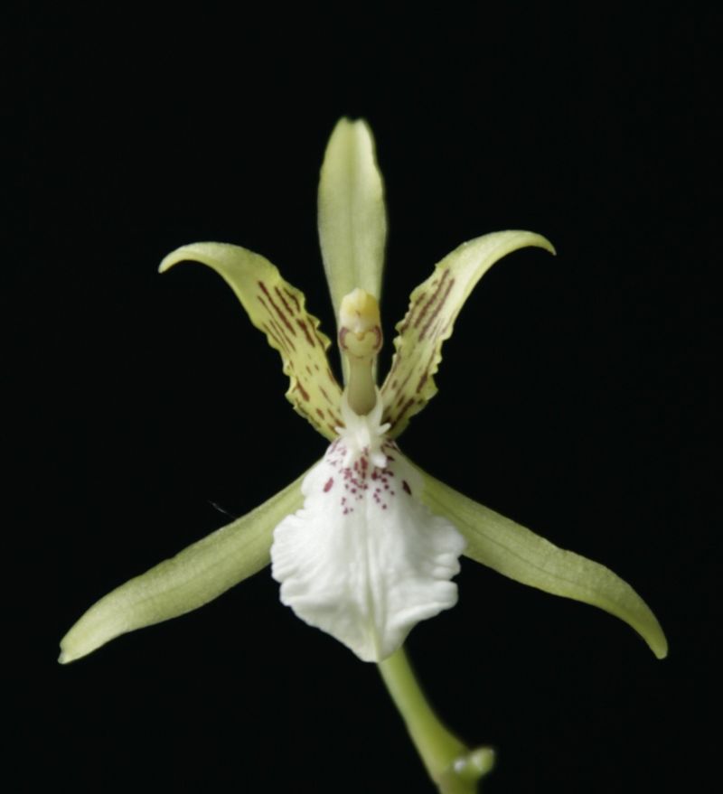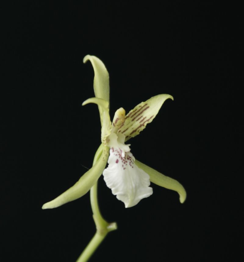 Found in Peru and Bolivia in wet montane cloud forests at elevations around 2700 to 3300 meters as a large sized, cold growing epiphyte with oblong to ovoid, laterally compressed pseudobulbs enveloped basally by one or more pairs of short, distichous, leaf-bearing sheaths and carrying 2, apical, narrowly oblong to strap-shaped, acute leaves that blooms in the summer on an axillary, elongate, loosely shortly branched, each branch3 to 8 flowered, fractiflex, many flowered inflorescence with carrying wide spreading flowers