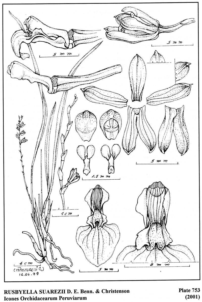 References W3 Tropicos, Kew Monocot list , IPNI ; Icones Orchidacearum Peruviarum Plate 753 Bennett & Christenson 2001 as Rusbyella suarezii drawing fide; Rudolf Schlechter Die Orchideen Band 1C lieferung 44-45 pg 2763 - 2898 Brieger 2001 as Buesiella suarezii; Rudolf Schlechter Die Orchideen Band 1C lieferung 44-45 pg 2763 - 2898 Brieger 2001 as Rusbyella suarezii; LANKESTERIANA 14(1) 2014 as Rusbyella suarezii;