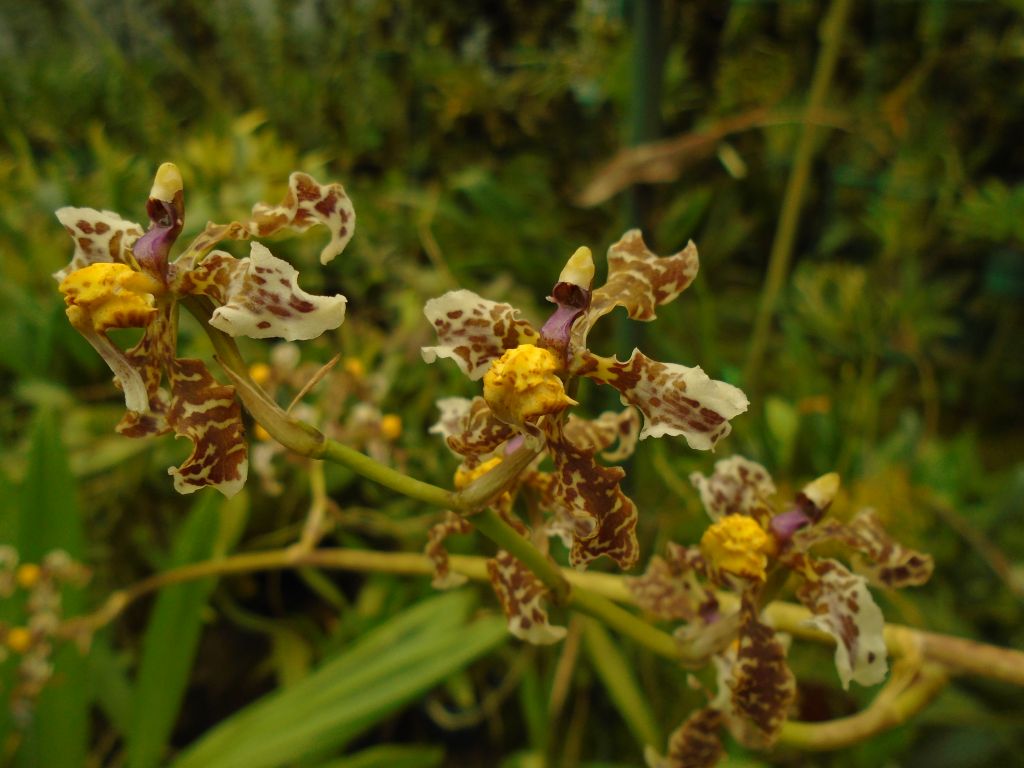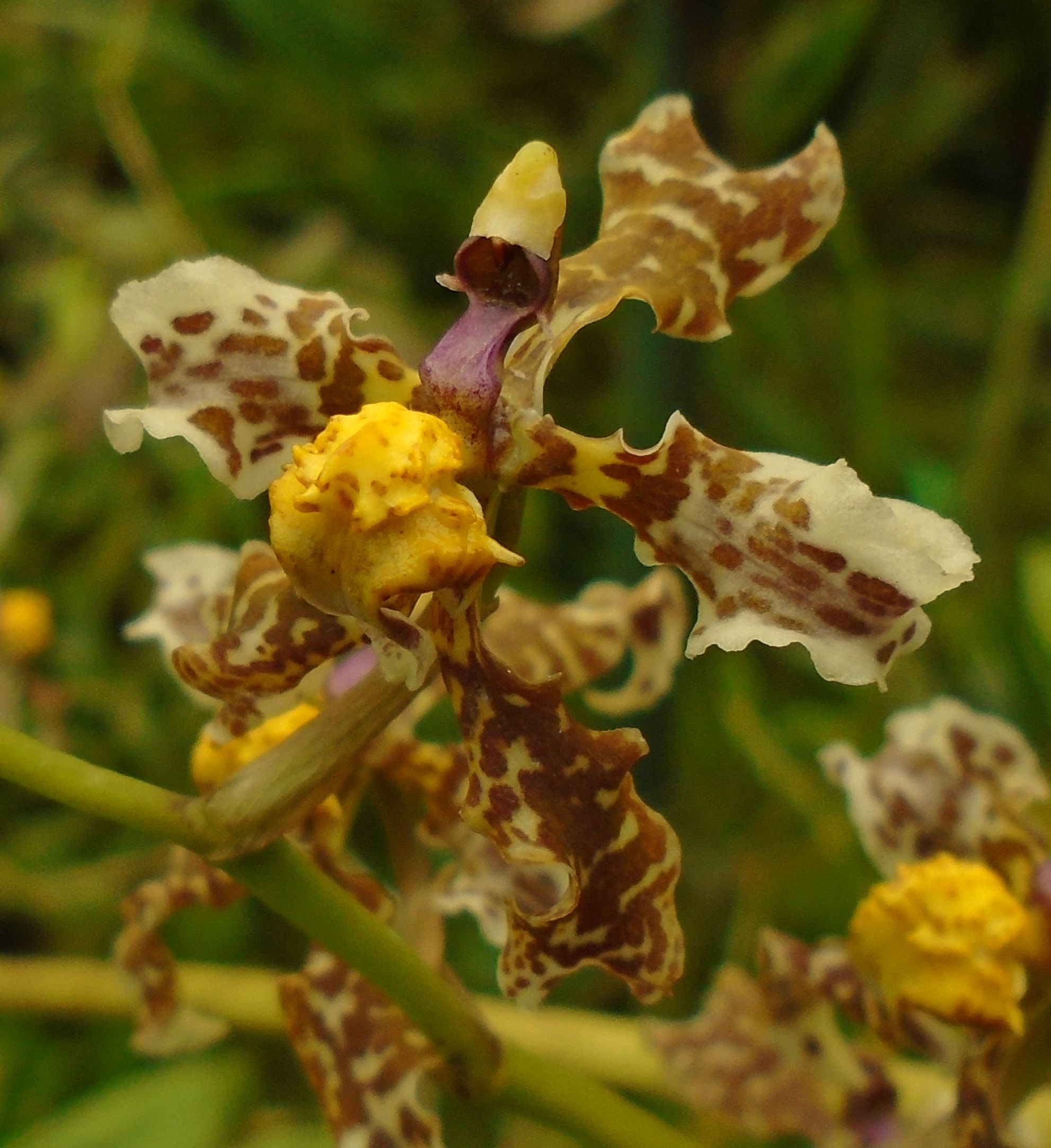 Found in Colombia and Venezuela in more open forests at elevations of 1200 to 1800 meters as a just large sized, cool growing terrestrial orchid with a terete, woody, tough rhizome giving rise to gree, slightly compressed, smooth to slightly wrinkled pseudobulbs enveloped basally by several pairs of distichous, imbricating, leaf-bearing sheaths and carrying 2 to 3, apical, erct to arching, lanceolate, acute, thin yet stiff, keeled, conduplicate below into the stiff, petiolate base leaves that blooms in the summer on a 6'8" to 10'2" [2 to 3 m] long, paniculate, numerous branched, each to 8" [20 cm] long, sometimes to 16" [40 cm] long, each to 8 flowered, sometimes shortly secondarily branched to 3 flowered, purple spotted, scandent, to 50 flowered inflorescence with triangular, adpressed, yerllow brown bracts.