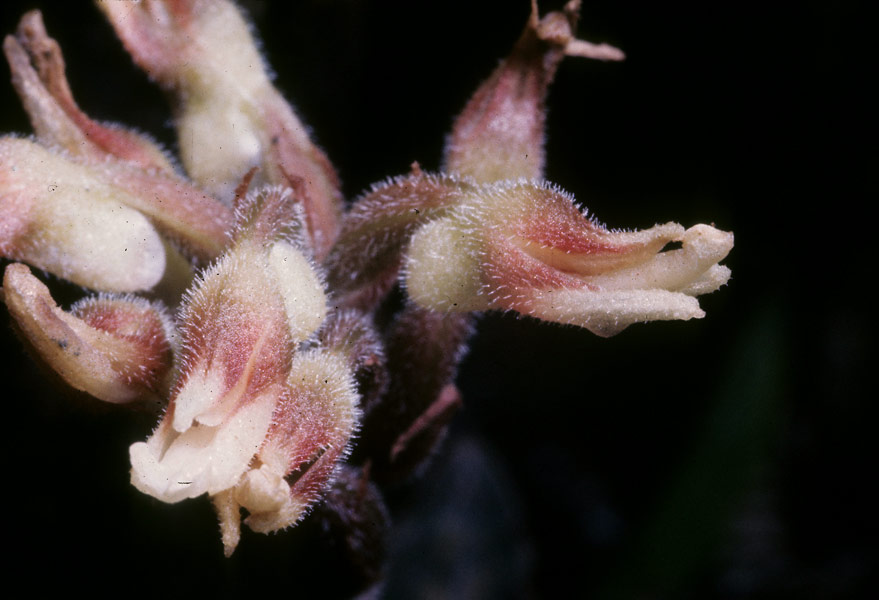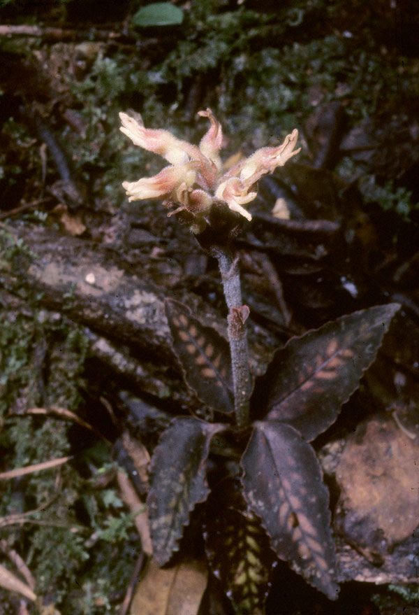 Found in northern Sumatra at elevations around 670 to 1000 meters as a miniature sized, warm growing terrestrial with a terete, glabrous, minutely glandular towards the inflorescence stem carrying 4 to 6, spreading, dull velvety brown with lighter blotches, obliquely ovate-ellipitc, glabrous, apiculate, rounded below into the petiolate base leaves that blooms in the fall on a terminal, erect, dense, three to seven flowered inflorescence with lanceolate, acuminate, equal to slightly larger than the ovaries floral bracts