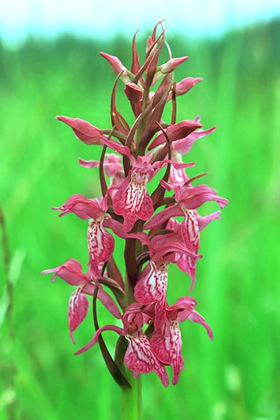 Found in Ireland, Great Britain, Norway, Sweden, Finland, France, Netherlands, Germany, Czechoslovakia, Austria, Switzerland, Italy, Yugoslavia, Poland, Belarus, all of Russia and western Siberia in alpine peat bogs at elevations up to 2100 meters as a small to medium sized, cold growing terrestrial found in lime rich soil with 2 to 4 lobed tubers with a short to long stem carrying 4 to 7 linear to oblong-lanceolate, almost erect, spotted or plain leaves that blooms in the late spring and early summer on a terminal, erect, 1.2 to 4" [3 to 10 cm] long, cylindrical, lax, racemose inflorescence that has bracts that are longer than the flowers.