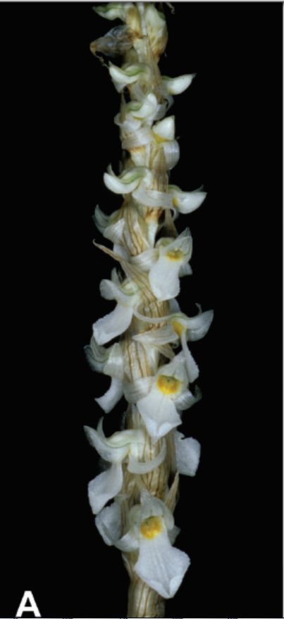 Found in Hidalgo state of Mexico in pine/oak forests at elevations of 2790 to 2840 meters as a small to medium sized, cold growing terrestrial with an acaulescent stem carryint 2 to 3, in a basal rosette, linear-lanceolate, acute, bluish green, withered to absent at blooming which occurs in the spring on an erect, terminal, completely glabrous, greenish-white, nearly completely enveloped by 8 to 15 papery, acuminate, whitish with brownish red veining, bracts, 5.6 to 14.8" [14 to 37 cm] long, rachis 1.6 to 3.4" [3.5 to 8.5 cm] long, 15 to 45 flowered inflorescence with transluscent, colorless, with reddish brown veins, ovate, acuminate floral bracts and carrying resupinate, spirally arranged, delicately diurnally scented, mostly simultaneously opening flowers