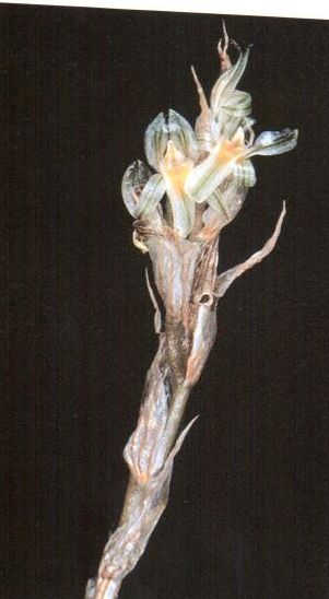 Found in Mexico, Guatemala and Honduras in open pine-oak forests among pine needles on relatively dry montane Pacific slopes at elevations around 2200 meters as a small sized, cold growing terrestrial with an erect stem enveloped by basal bracts, greenish and withered at blooming, and above, transluscent, brown lined bracts that blooms in the spring on a terminal, erect, rachis 1.6 to 3.6" [ 4 to 9 cm] long, few flowered inflorescence with the flowers concealed partially by imbricating, ovate to obovate, acuminate bracts similar to those below and carrying diurnally fragrant flowers.