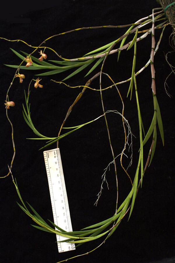 Found in Sulawesi and the Moluccas in coastal forests at elevations of sea level to 300 meters as a giant sized, hot growing epiphyte with erect, slightly basally swollen stems carrying in an elongate fan, flattened sideways, acute leaves that blooms in the winter and early spring on the bare upper part of the stem with many, short, successively 1 to 2 flowered inflorescence.