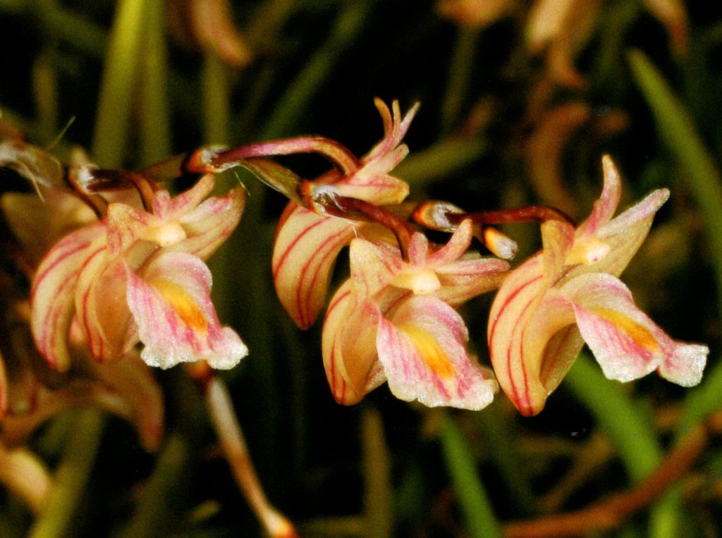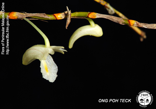 Found in the Philippines, Borneo, Suluwesi, Sumatra, Malaysia, Singapore, Thailand and Myanmar at elevations of 50 to 1600 meters in lowland open spaces and swamps on trees and rock faces often in full sun as a miniature to small sized, hot to cool growing, pendulous epiphyte and ocassional lithophyte with stemlike, slender, flexuous, branching and usually pendant, usually fractiflex stems and carrying in the lower 2/3's, 7 to 10, persistent, flat, spreading, fleshy, succulent, recurved, sharply pointed, grooved, and loosely distichous leaves that blooms in the fall and spring on a 2 to 6" [5 to 15 cm] long, 1 to 3 flowered inflorescence arising on the apical, leafless portion of the stem.