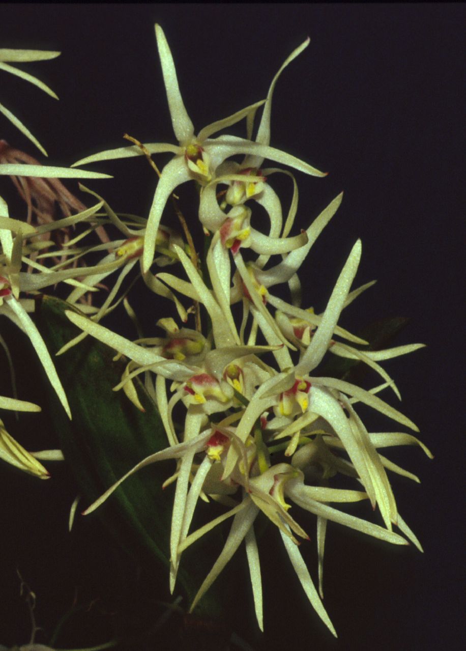 This epiphytic and sometimes lithophytic species is endemic to Australia from southeastern New South Wales to northeastern Queensland and is found at elevations of 30 to 1300 meters in lowlands and mountains along streams and in open humid forests with 6 noded, smooth, cylindrical stems clustered tightly together, enveloped by sheaths and carrying 2 to 4, apical, ovate, glossy, dark green leaves. It blooms from mid-winter till mid-spring on a short to 4" [5 to 10 cm], fairly dense raceme that arises from the upperleaf nodes of old and new canes and carries 2 to 12, sweetly fragrant flowers.