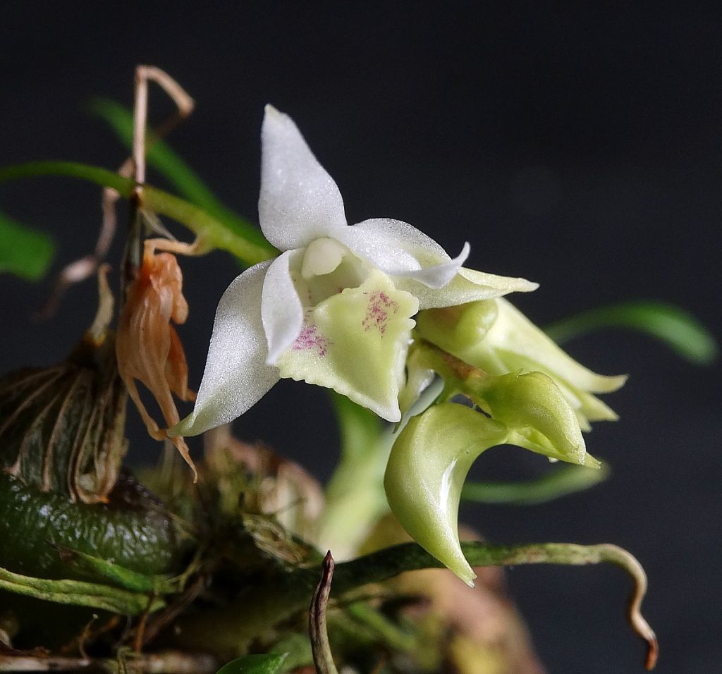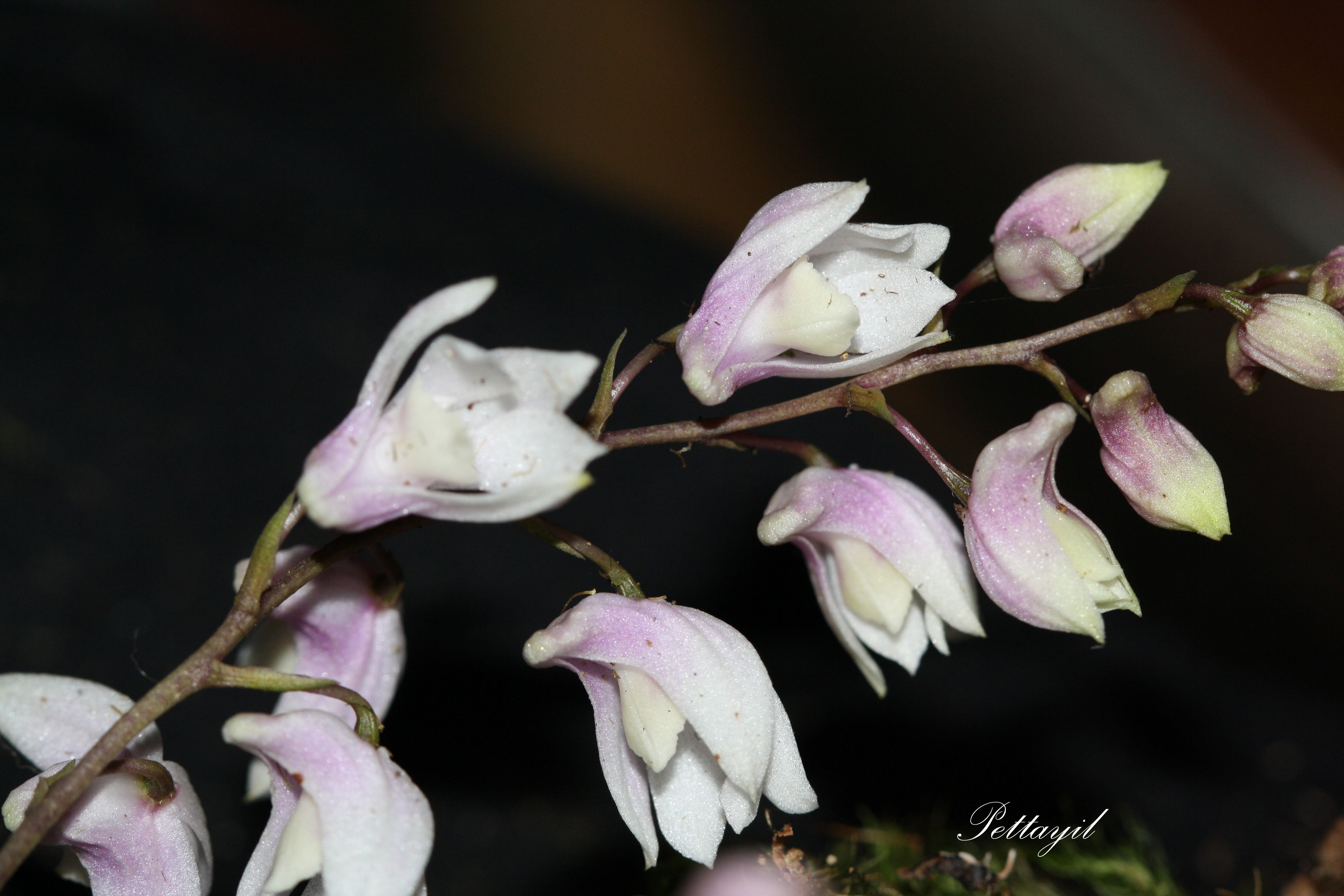 Found in southern India at elevations of 1000 to 1980 meters as a mini-miniature sized, cool growing epiphyte with ovoid, greenish-pink stems enveloped basally by sheaths and carrying 2 at the stem apx, elliptic leaves that blooms in the summer on an erect, arising between the leaves at the apex of the stem, 5" [12.5 cm] long, 5 to many flowered inflorescence