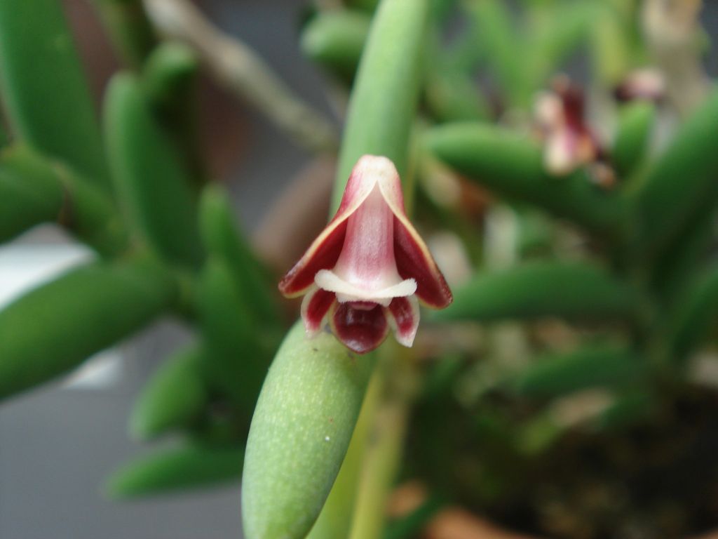 Found in Sarawak Borneo in lowland forests at elevations around 300 meters as a miniature sized, hot growing epiphyte with fleshy erect stems carrying fleshydistichous, linear-lanceolate, obtuse leaves that blooms on a terminal short, single flowered inflorescence