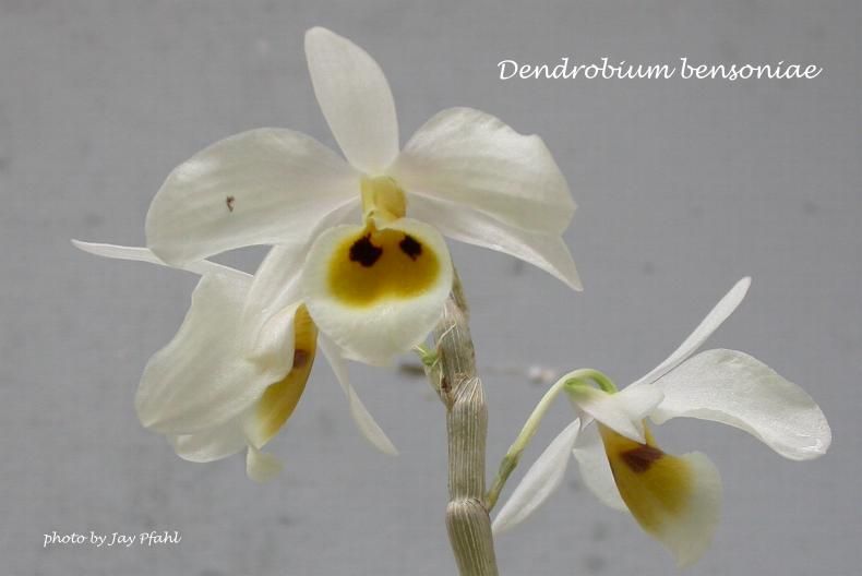 References W3 Tropicos, Kew Monocot list , IPNI ; Orchids of Burma Grant 1895/1995; Orchidaceae Monandre-Dendrobiinae Fr. Kraenzlin 1910; Die Orchideen Schlechter 1915; Die Orchideen 2 Auflage Schlechter 1927; Atlas des Orchidees Cultivees Constantin 1920 as Eudendrobium bensoniae drawing fide; Flora of Malaya Vol 1 Orchids Holttum 1953; The Orchids of Thailand Seidenfaden & Smitinand 1960; Encyclopedia of Cultivated Orchids Hawkes 1965; Beautiful Indian Orchids and How to grow them Ghose 1968; Indian Orchids, A guide to Identification and Culture Vol II Pradhan 1979 photo fide; Opera Botanica #83 Orchid Genera in Thailand XII Dendrobium Sw. Seidenfaden 1985 drawing fide; Manual of Orchids Stewart 1995; Orchid Species Culture; Dendrobium Bakers 1996; The Dendrobiums H. P. Wood 2006 photo fide; Australian Orchid Review Vol 72 No 4 2007 photo; Wild Orchids in Myanmar Vol 3 Tanaka 2007 photo fide ; Orchids of India A Glimpse Misra 2007; AOS Bulletin Vol 80 #2 2011 photo fide; Wild Orchids of Myanmar Hyan Tun [Mr Myanmar] 2014 Photo fide; A Guide to the Orchids of Myanmar Kurzweil & Lwin 2014 photo fide