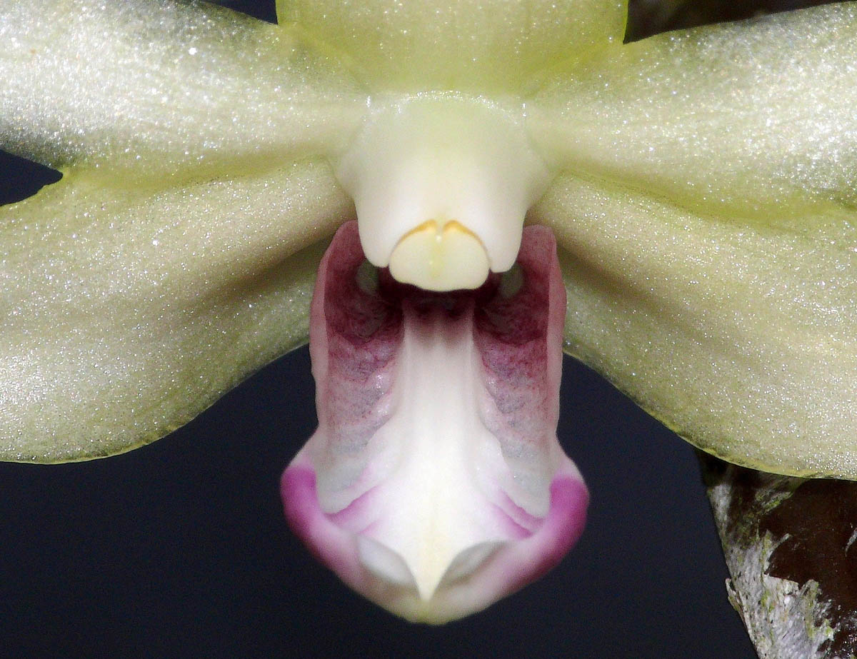 Found in the Philippines on brightly lit tree trunks at elevations up to 500 meters as a small sized, hot growing epiphyte with pendulous, basally thin, gradually thicken towards the apex stems carrying 2 ranked leaves that blooms on a short, single flowered inflorescence arising from near the apex of the stem and carrying very showy, short lived flowers.