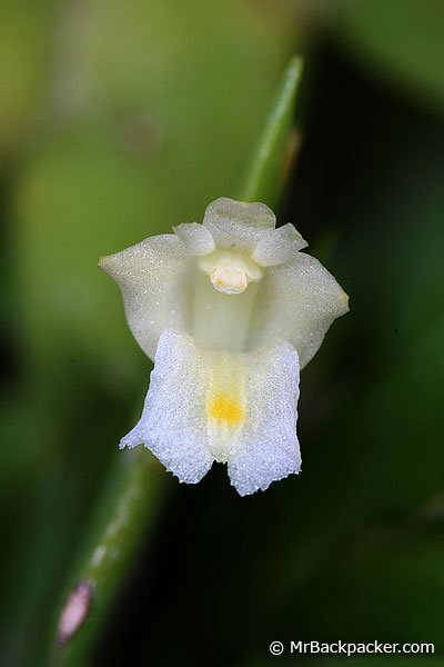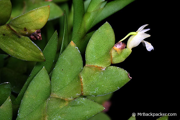 Found in Thailand and Vietnam at elevations of 10 to 1500 meters as a medium sized, hot to cool growing epiphyte with often branching, downward turning but not pendant canes carrying many triangular, distichous, textured leaves held at a 40 degree angle to the cane and are all in one plane and blooms on a very short, single flowered inflorescence arsing from both young leafy and older leafless canes. and blooms in the winter on .3" [.8 cm] long, 1 to 3 flowered inflorescence with the flowers arising opposite the leaves and do not open fully.