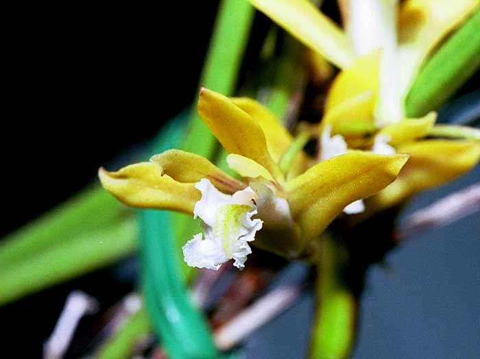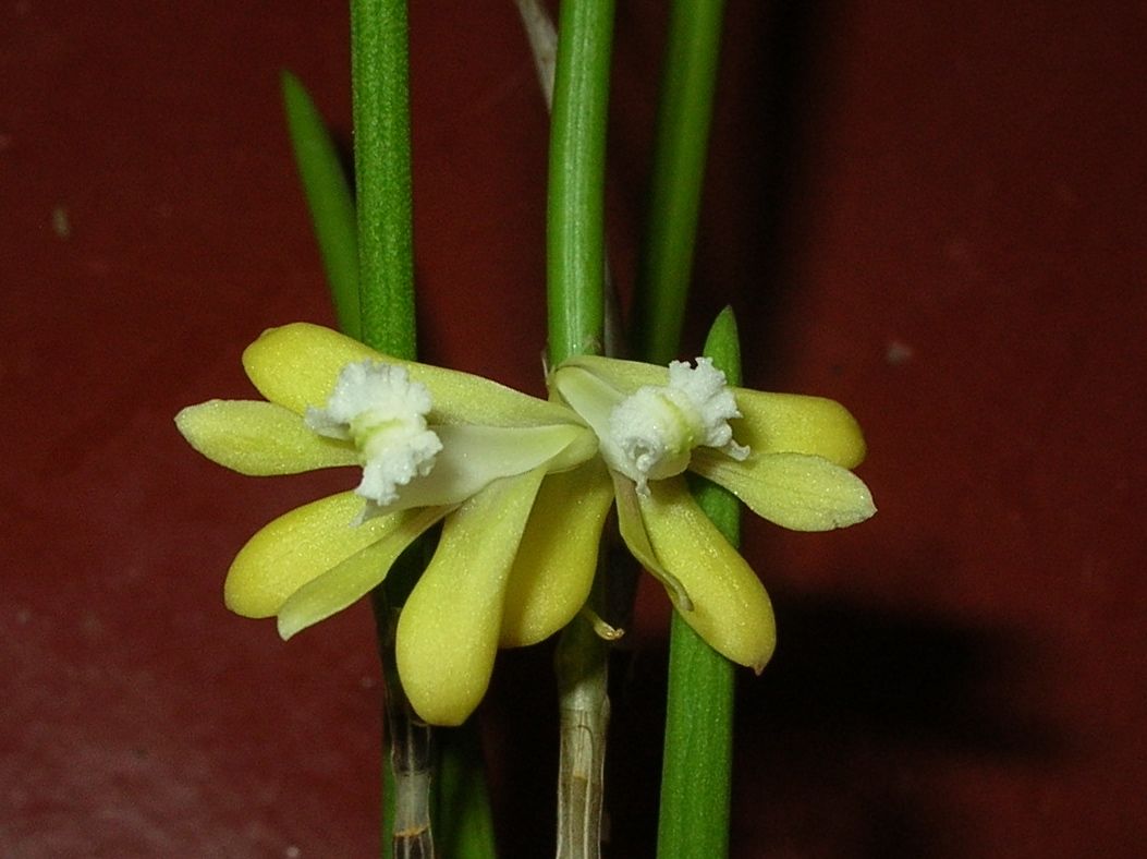 Found in Queensland and New South Wales Australia as a miniature to small sized, epiphytic, hot growing species that is found in dry open areas or on the coastal plains near creeks and mangrove swamps at elevations of sealevel to 200 meters. This orchid grows by having new branches emerge from the upper nodes of the previous years branch carrying a single grooved leaf and the bloom season is from late winter to spring on a short inflorescence that arises from the nodes near the new leaves at or near the apex of the cane and it needs a drier winter rest but should not be allowed to dry out completely.