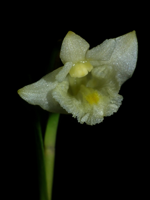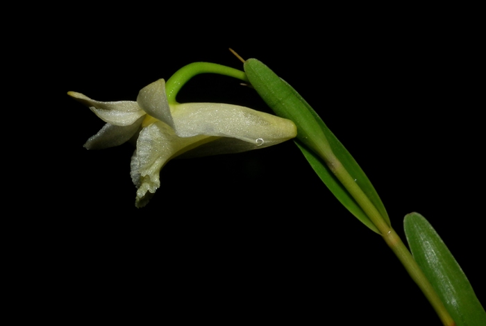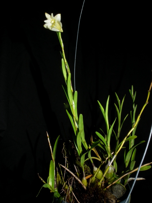 Found in the Philippines often in full sun, at elevations up to 800 meters as a medium sized, warm growing epiphyte with clustered, ovoid, wrinkled, to 2" [5 cm] long, topped by 14" [35 cm] long leafy stems carrying lanceolate, obtuse, erect to arching, thin textured, basally sheathing the stems leaves that blooms in the spring on an axillary, short, single flowered inflorescence and carrying slightly fragrant flowers.