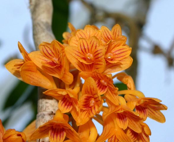 This medium sized, hot to warm growing, epiphytic species is found in the Philippines in evergreen lowland forests at elevations up to 1000 meters with slender, slightly fractiflex, attenuate below, many noded, sulcate stems covered with sheaths and carrying submembraneous, ovate-oblong, obtuse leaves that are unequally bilobed apically and have clusters of orange flowers with red lines that arise on short to 2 1/2" [6.25 cm], densely flowered, almost globose inflorescence from all along the older dry canes.