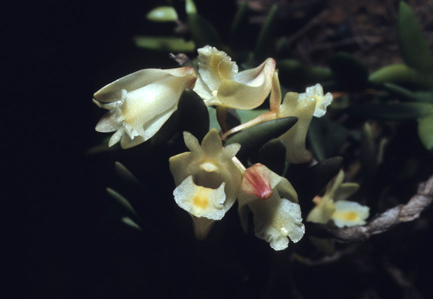 Found in Bangka Sumatra at elevations around 760 meters as a small sized, warm growing epiphyte with clustered, flattened, yellowish green stems carrying patent, somewhat laterally flattened, linear-lanceoalte, upper margins curved, lower ones straight, acute, fleshy, pale green leaves that blooms in the spring on a short, 1 to 2 flowered inflorescence