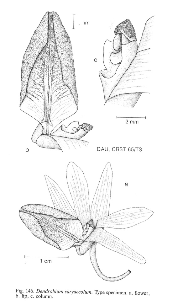 References W3 Tropicos, Kew Monocot list , IPNI ; Identification of the Orchids [Orchidaceae Juss.] Vietnam Averyanov 1994 as D caryaecolum; Orchid Species Culture Dendrobium Bakers 1996 as D caryaecolum