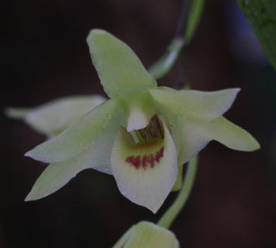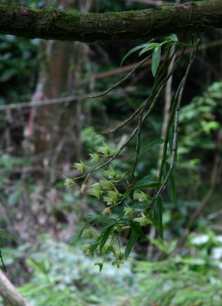 An orchid of Korea and China, Japan, The Ryukyus and south to Taiwan found growing in moderately damp montane forests as a small to medium sized, cool to warm growing epiphyte and also growing on rocks at altitudes of 300 to 1600 meters with long, clustered, terete, pendant or erect, pale green stems carrying to 12, ligulate-lanceolate, acute, deciduous leaves. The bloom season is in the mid-winter till mid-spring and a late fall curtailing of water and fertilizer prepare the plant to bloom on a lax, 3/4 to 2 2/5" [2 to 6 cm] long, few to several [4 to 5] flowered inflorescence that arises from the nodes near the apex of 2 to 3 year old leafless canes.